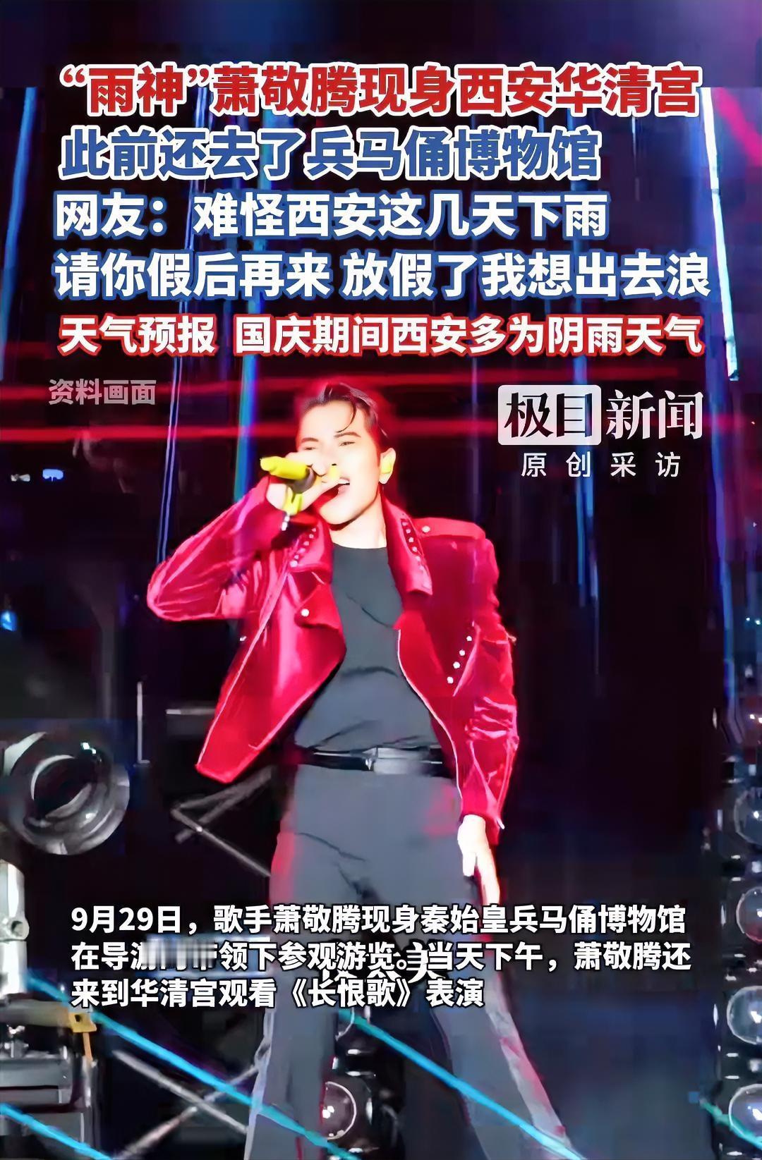 雨神“萧敬腾”来西安火上热搜了 我就说国庆黄金周,西安天天下雨。 不管是身为西安人,还是来西安旅游的人,心情就跟着阴沉的天气一样沉闷,后面好几天还是雨,没完没了的下。 没想到雨神“萧敬腾”来西安了,这就能解释的通了。 网友们纷纷评论:哥哥“萧敬腾”放假了你就在家好好待着吧,不要全国乱跑! 还有评论,让萧敬腾赶紧去隔壁“山西”,陕西不缺雨,大家都快发霉了! 这也不怪大家这样说,毕竟萧敬腾以前不管去到那里,那里就下雨。 “萧敬腾”:这锅都背了好几年洗不清了,哈哈! 我想说,要不让“萧敬腾”去沙漠开一年的演唱会,大家说沙漠会不会变绿洲呢?