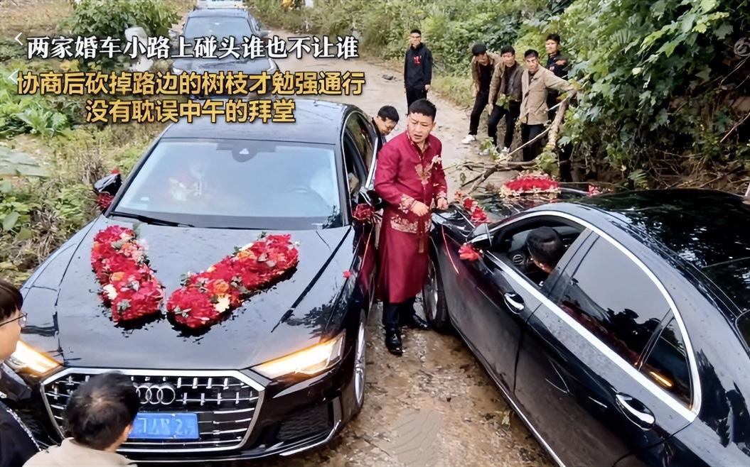 “婚车不走回头路就能婚姻顺遂?”山东菏泽两对新人婚车队伍在狭窄涵洞小路相遇,双方