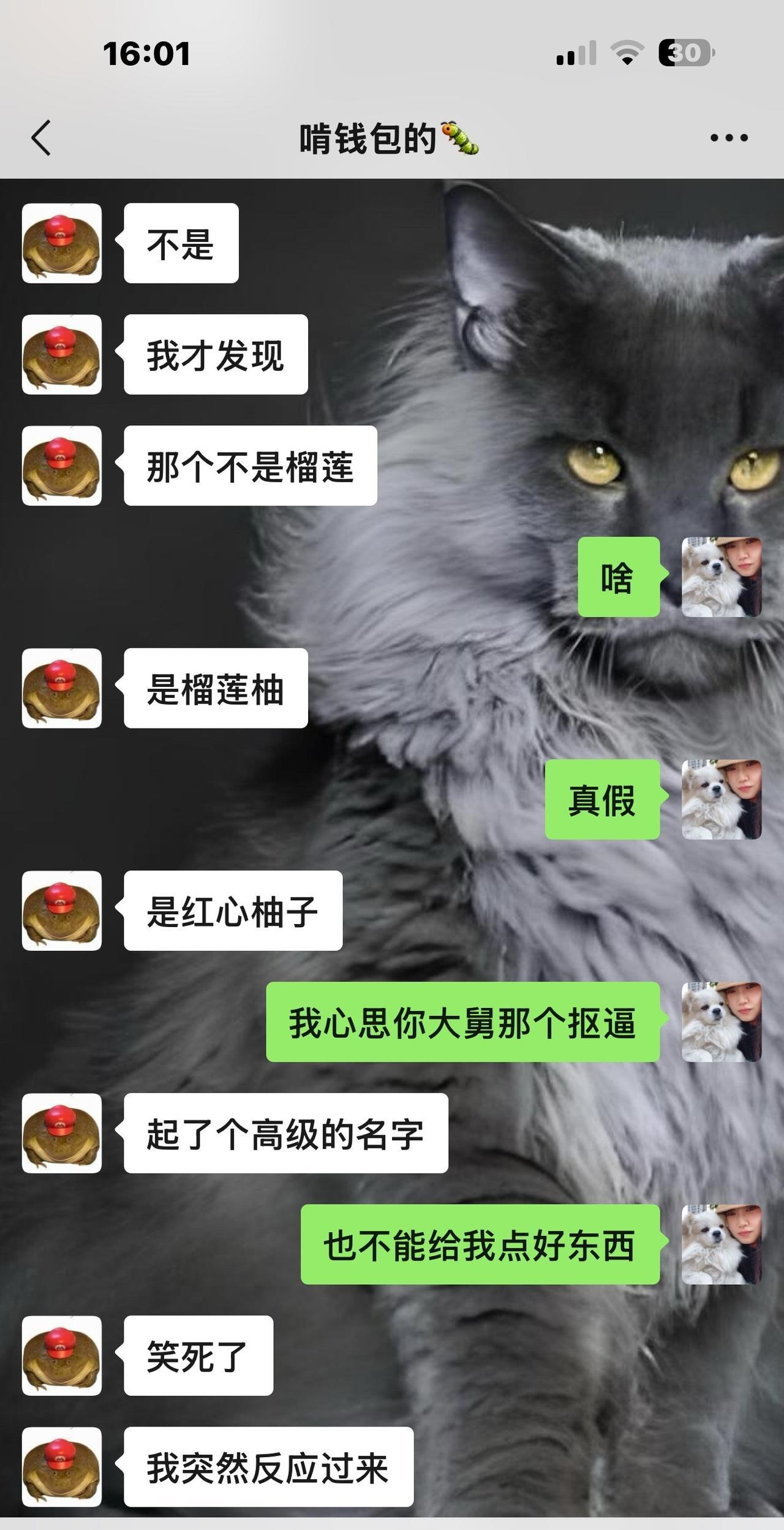 谁他丫的发明的这玩意叫“榴莲橙”的? 俺家太子给我送来的,我瞎了吧唧的光看到外包装画了一个橙子也没打开更没有仔细看。 正好闺女要吃榴莲我就说恁大舅送了一个榴莲来,等你来吃了吧。 闺女说:“俺大舅送的榴莲?这么大方了吗?” 我说:“是榴莲,你大舅驴屎蛋子发热了,我看到上面画了一个榴莲了。” 然后闺女给我确认了一下,我这才看了看确实不是榴莲,连榴莲橙。 特奶奶个腿的,这玩意跟榴莲没有一毛钱关系,就是个红心橙子。 哈哈哈,我也纳闷怎么俺大兄弟突然的那么大方给她姐姐送榴莲来了。