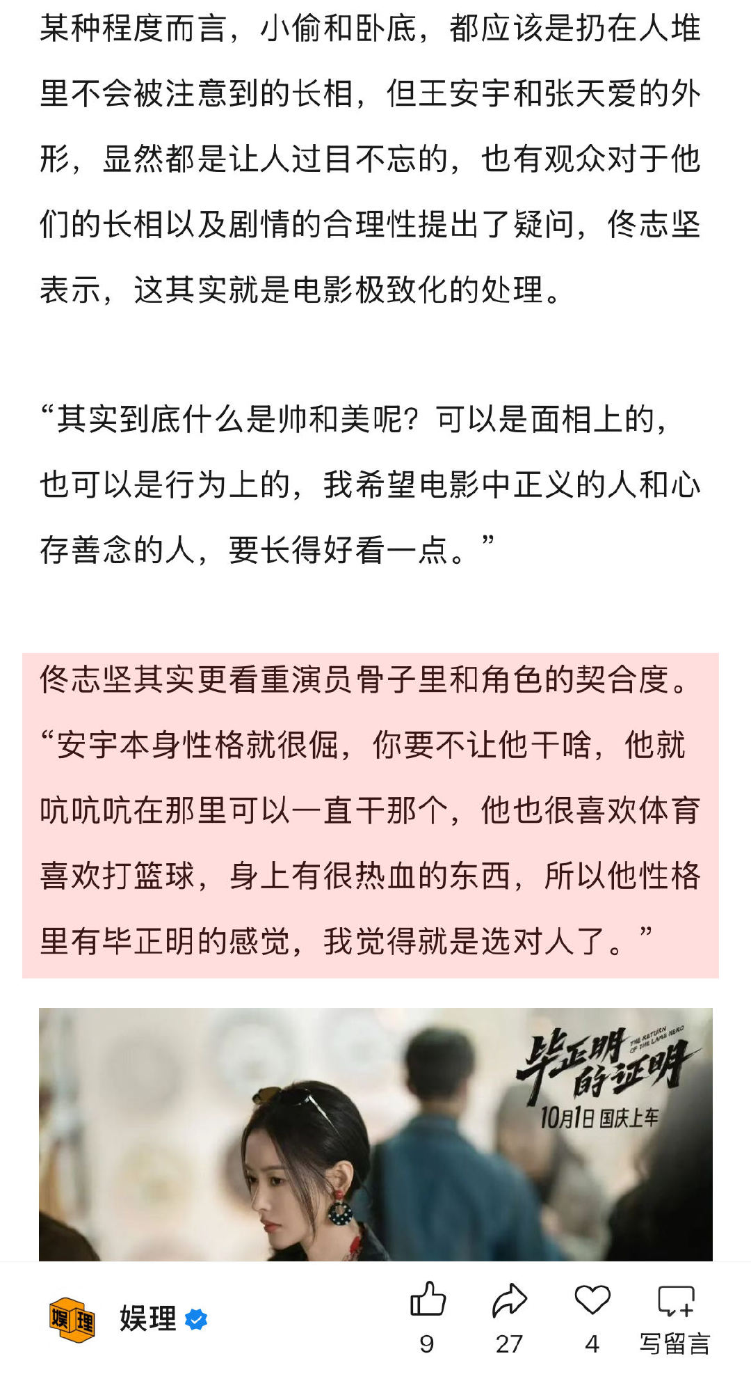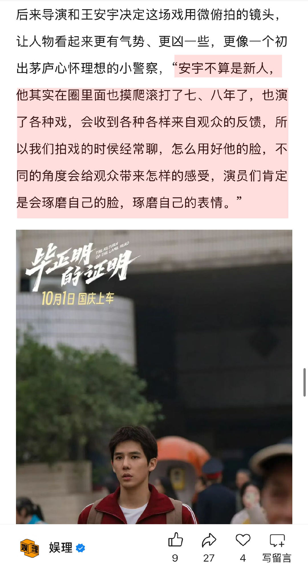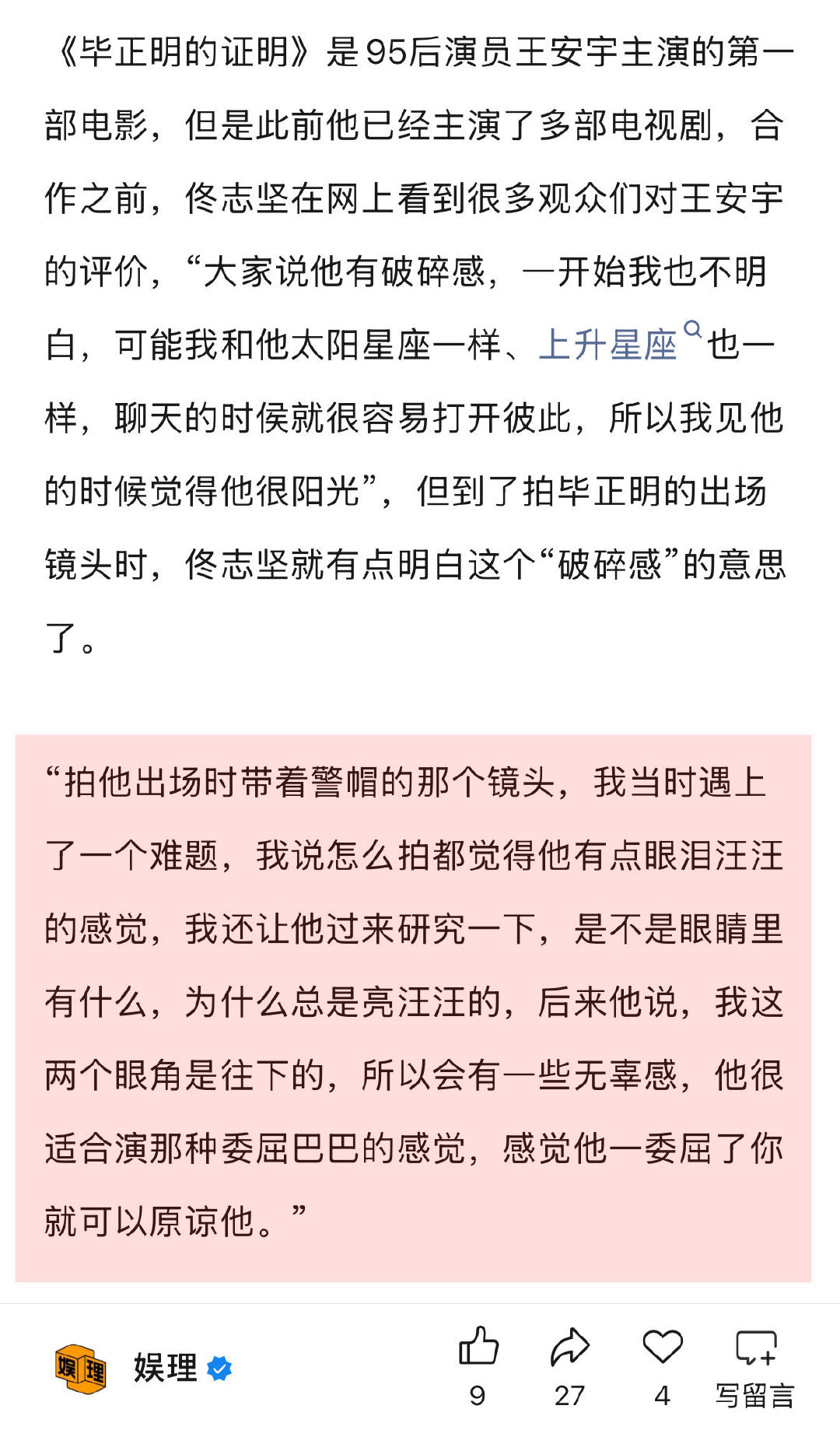 导演说选王安宇是选对人了 毕正明的导演谈王安宇的破碎感 《毕正明的证明》是95后演员王安宇主演的第一部电影。合作之前,导演佟志坚看了很多评价,“大家说他有破碎感,一开始我也不明白,可能我和他星座一样,我觉得他很阳光”,但到了拍毕正明的出场镜头时,佟志坚就有点明白这个“破碎感”的意思了…娱理独家↓