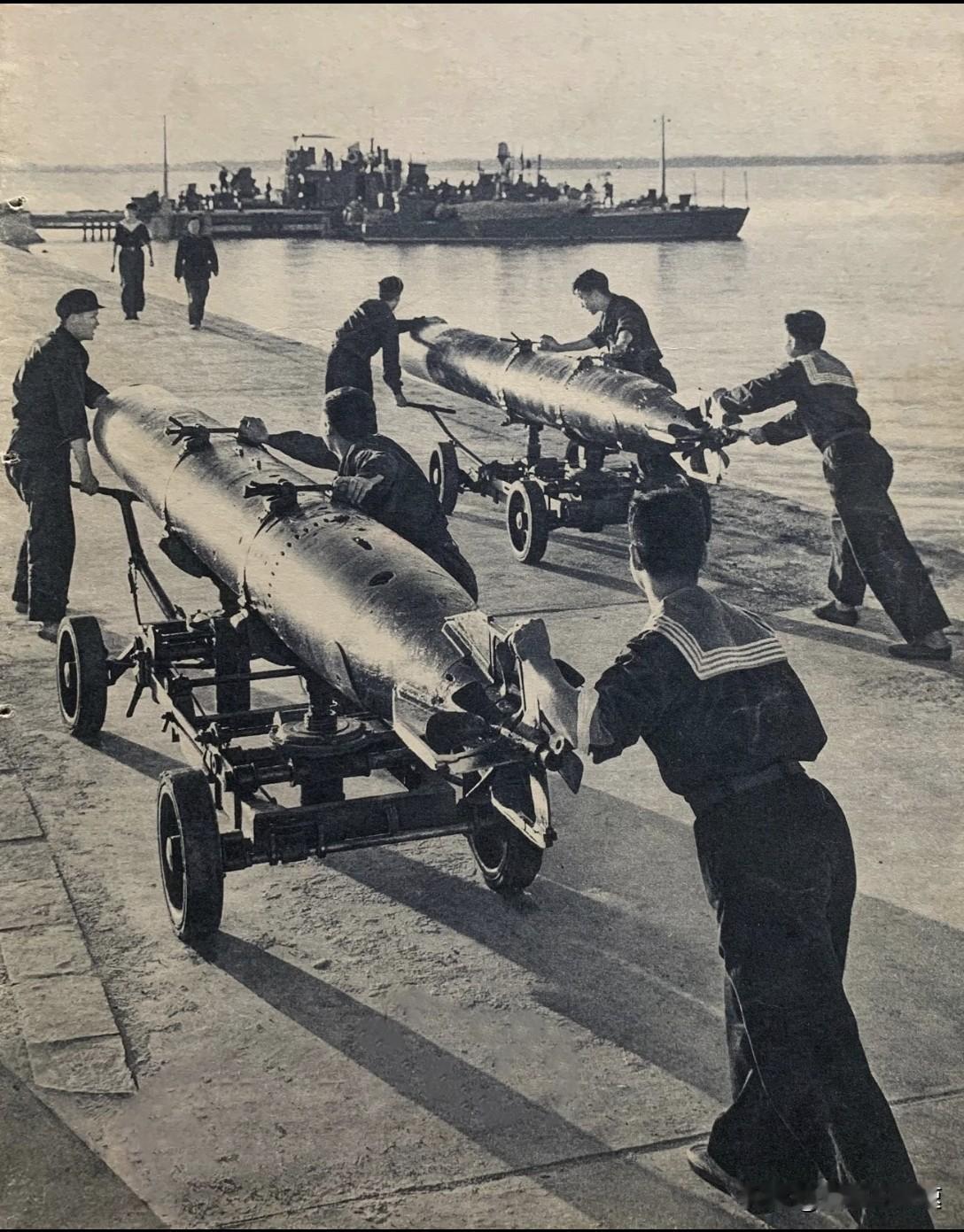 现在的正装照,怎么很难威武雄壮呢?看看这幅图,重点突出,大大方方。 - 鱼雷型号:推测为苏制53-39型瓦斯热动力鱼雷(配备于6602型鱼雷艇)或450毫米口径直航鱼雷(配备于P-4型鱼雷艇)。 - 舰船型号:背景中的舰船是P-4型(123型)或6602型(P-6型)鱼雷艇。P-4型鱼雷艇是新中国初期从苏联引进的首批鱼雷艇,标准排水量约20吨,最高航速42节;6602型是仿制苏制P-6型的鱼雷艇,排水量57吨,最高航速45节,这两型鱼雷艇在新中国海军早期近海作战中发挥了重要作用。