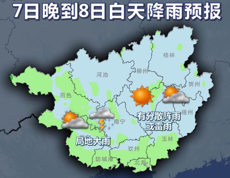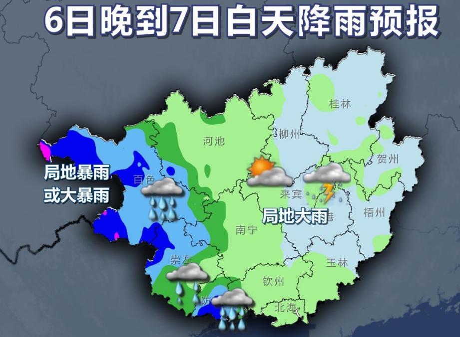 【今晚进入风雨核心时段 强风暴雨来袭注意防范】今天晚上,北海、钦州、防城港、崇左、南宁等市及玉林、百色两市南部有大雨到暴雨、局地大暴雨或特大暴雨,其它地区多云到阴有阵雨或雷雨、局地大雨。桂南有7~8级、阵风9~10级大风。沿海地区平均风8~10级、阵风11~12级。 6日白天,防城港、钦州、崇左、南宁、百色等市及河池市西部有大雨到暴雨、局地大暴雨,其它地区多云到阴有阵雨或雷雨、局地大雨。桂南、桂西有5~6级、阵风7~9级大风。 森林火险气象等级:全区1~2级,低火险到较低火险。 南宁市:今天晚上到明天白天,暴雨、局地大暴雨,东南风3~4级、阵风7~9级,最低气温22℃,最高气温27℃。 6日晚上到7日白天,百色、崇左、防城港、钦州等市及南宁市西部有中到大雨、局地暴雨或大暴雨,其它地区多云到阴有阵雨或雷雨、局地大雨。 7日晚上到8日白天,桂西多云有阵雨或雷雨、局地大雨,桂东晴到多云有分散阵雨或雷雨。 北部湾海面:今天晚上到明天白天,暴雨到大暴雨、局地特大暴雨,旋转风10~11级、阵风12~13级,台风中心经过的附近海域的风力有12~13级、阵风14~15级;6日晚上到7日白天,中到大雨、局地暴雨,东南风5~6级、阵风7~8级;7日晚上到8日白天,多云有阵雨或雷雨,偏东风4~5级,阵风6级。 合浦到东兴沿海各地台风警报站,所挂台风信号四号风球不改变。(广西气象台5日17时发布预报)