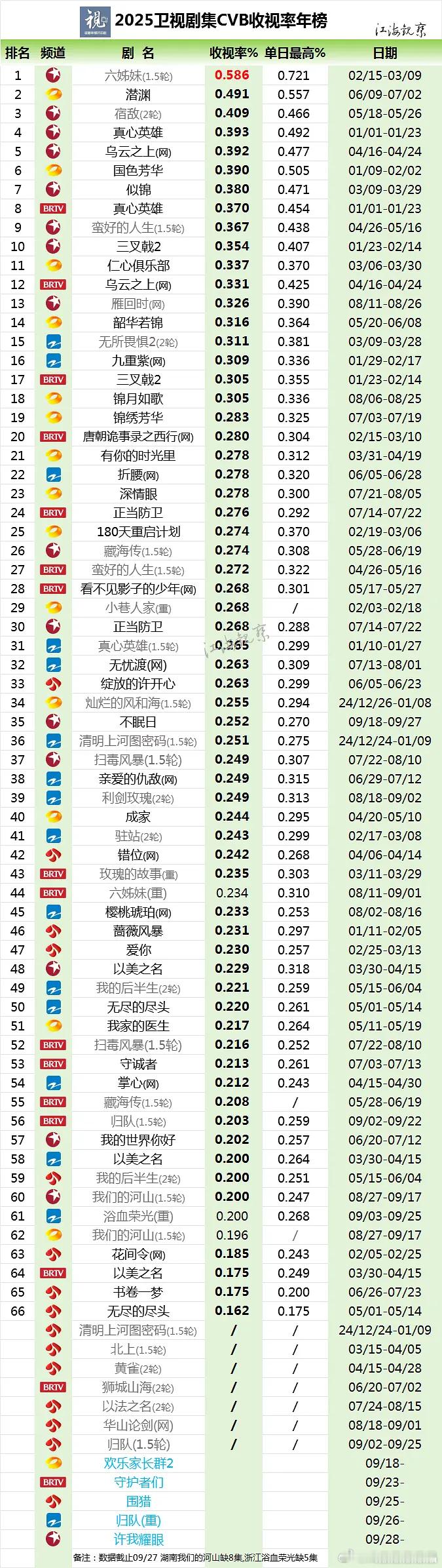 截止到目前,2025所有卫视收视率前十为:六姊妹、潜渊、宿敌、真心英雄、乌云之上、国色芳华、似锦、真心英雄、蛮好的人生、真心英雄2