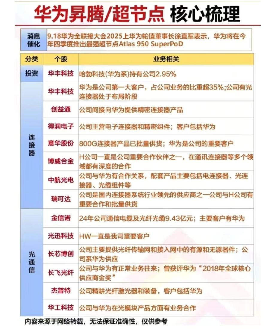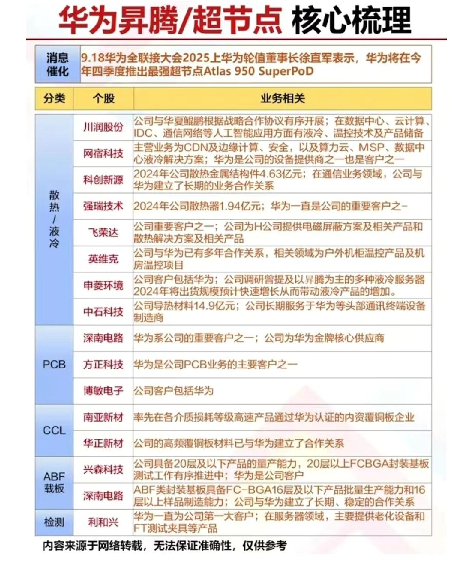 华为昇腾超节点核心龙头梳理 10月2日 央视发布一段约20分钟的采访视频,华为AI超节点集群被央视评为大国重器。华为昇腾384超节点由12个计算柜和4个总线柜构成,实现了业界最大规模的384卡高速总线互联! 华为昇腾超节点概念核心龙头代表:拓维信息、烽火通信、川润股份、科华数据、华胜天成、直真科技。 华为昇腾/超节点概念低位放量代表:拓尔思、彩讯股份、中航光电、安恒信息(行业科普不作推荐,理财有风险入市需谨慎!)华为算力芯片 华为AI产业链 国产算力概念股 AI算力国产化 国产算力产业链 华为技术总监 华为芯片国产化 AI算力板块 理财有风险投资需谨慎