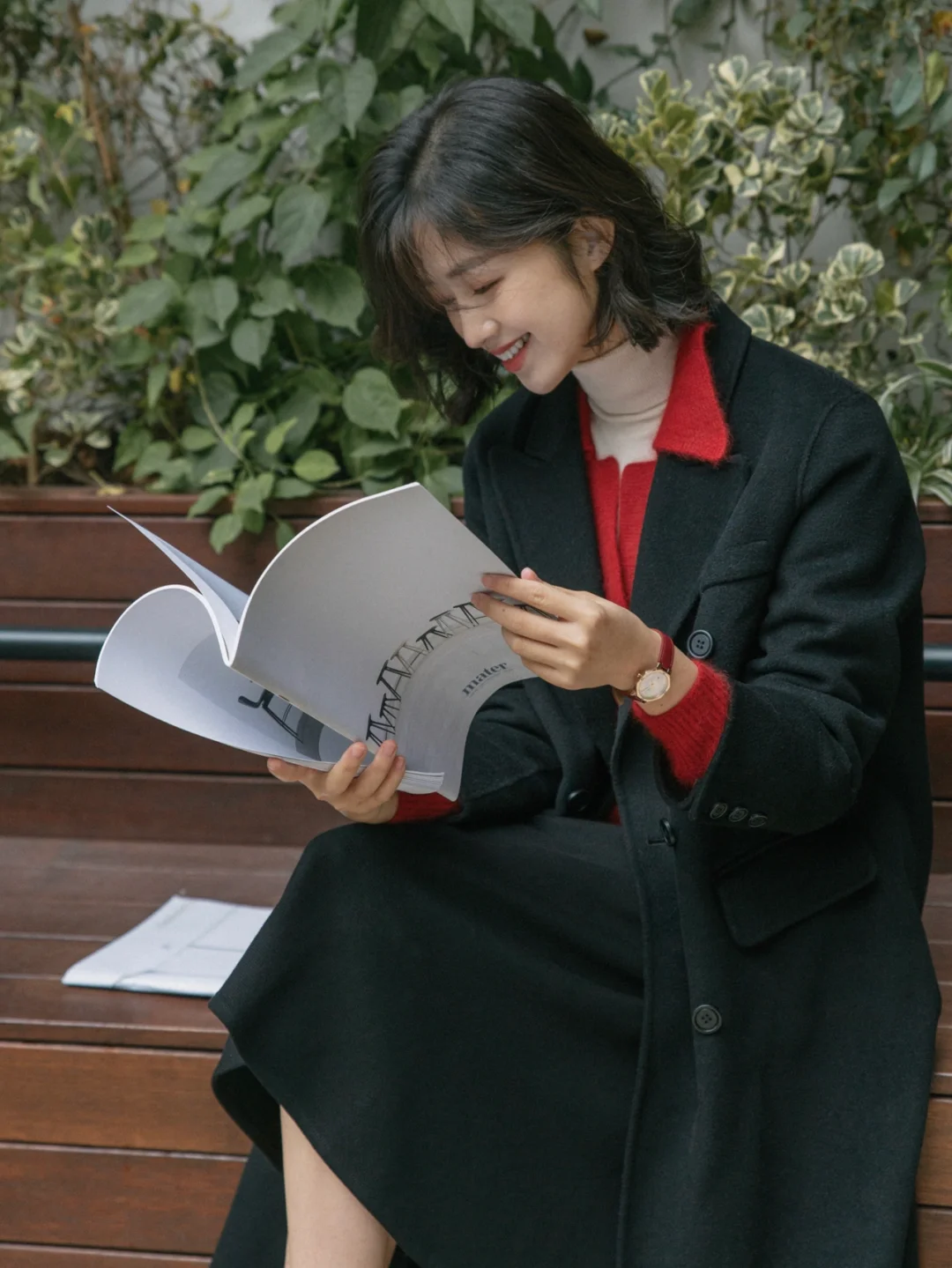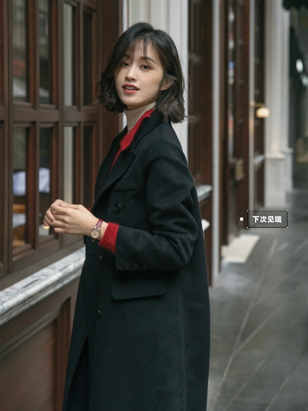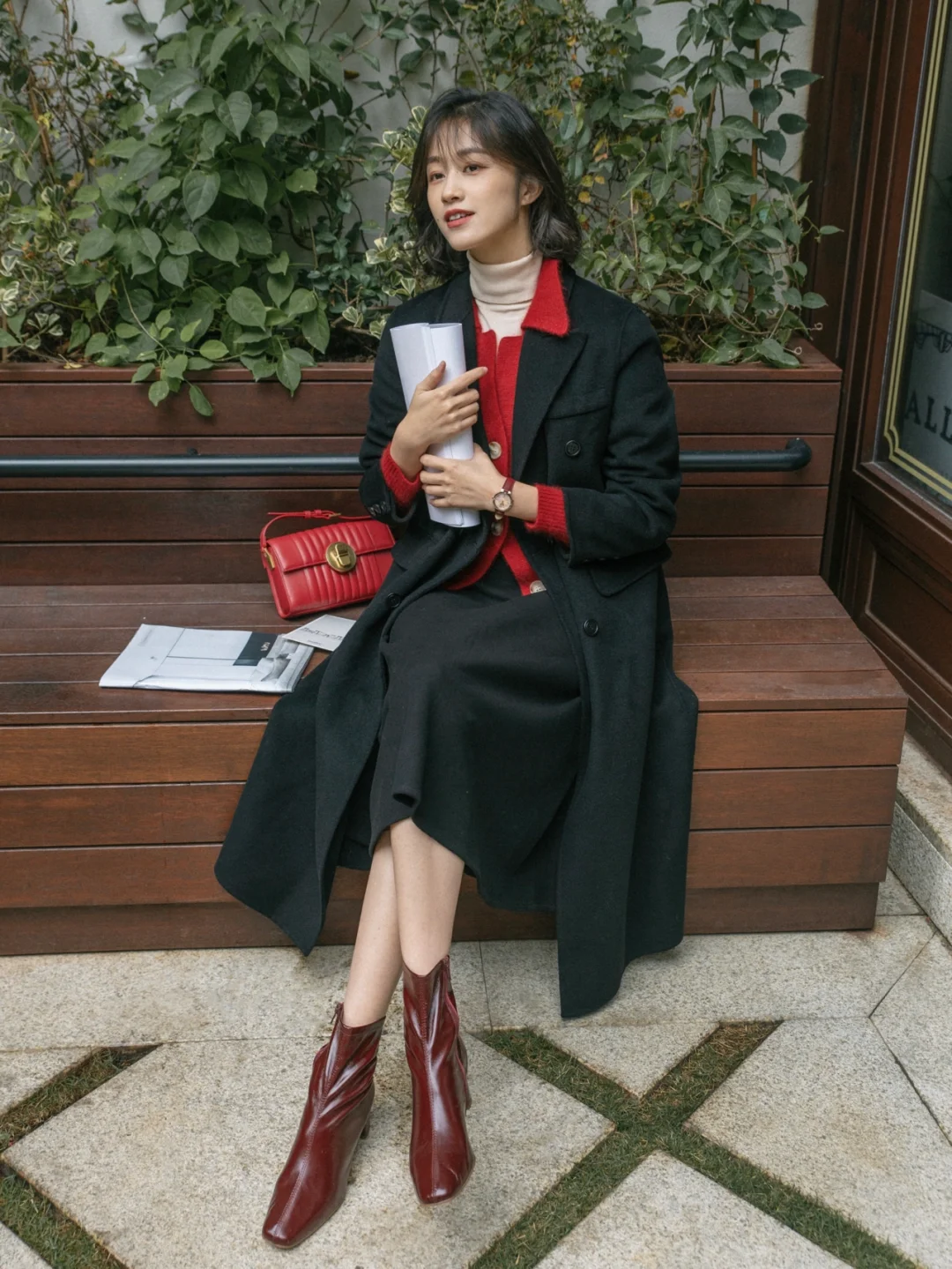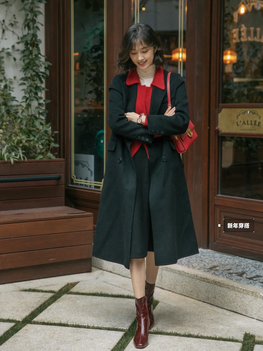 秋冬穿搭里黑大衣是高实穿性的外套之一,用日常穿搭里的黑大衣营造出新年感,红色单品就是首当其冲
