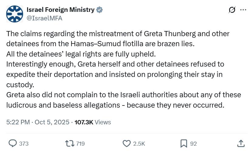 据多家外媒4日报道,被称为“环保少女”的瑞典气候问题活动人士格蕾塔·通贝里曾被以色列关入布满虫子的牢房,还强迫其举着以色列国旗拍照。5日,以色列外交部官方账号发文回应此事,称这些指控“纯属虚构”。