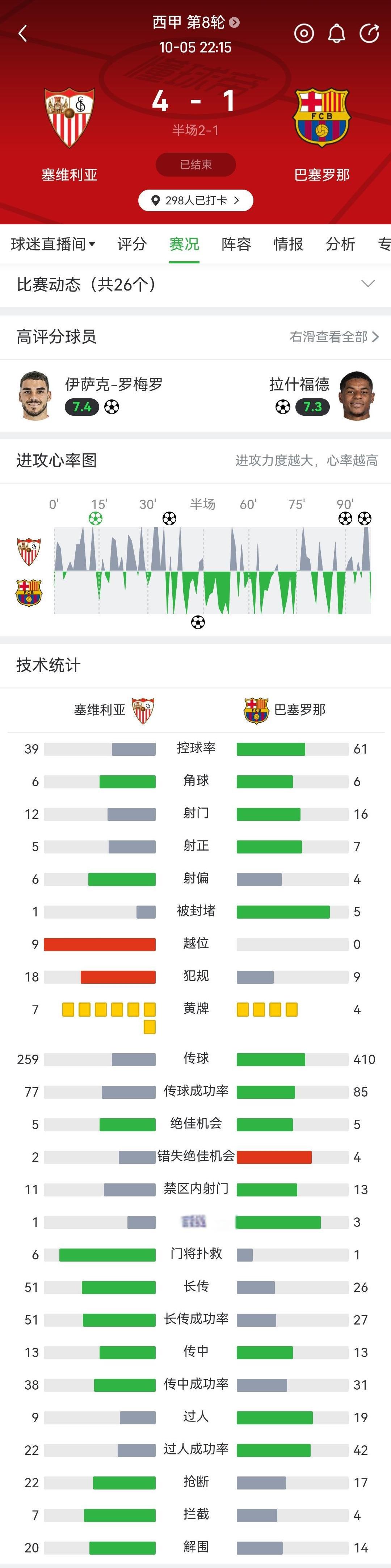 亚马尔缺阵,对巴萨的实力有影响,但不至于断崖吧。 西甲第8轮,塞维利亚主场迎战缺少内马尔的巴萨,祭出防守+快速反击的战术。 39%的控球率,正好,控球率又没什么用,立足防守抓好转换,一样可以赢得12次射门的机会。 尽管塞维利亚浪费了俩绝佳机会,但…伤停补时再进两个,4:1战胜巴萨,也很美好了。 巴萨的防守真差,在现代足球里,但凡不是实力过于悬殊,攻守失衡的球队,够呛。