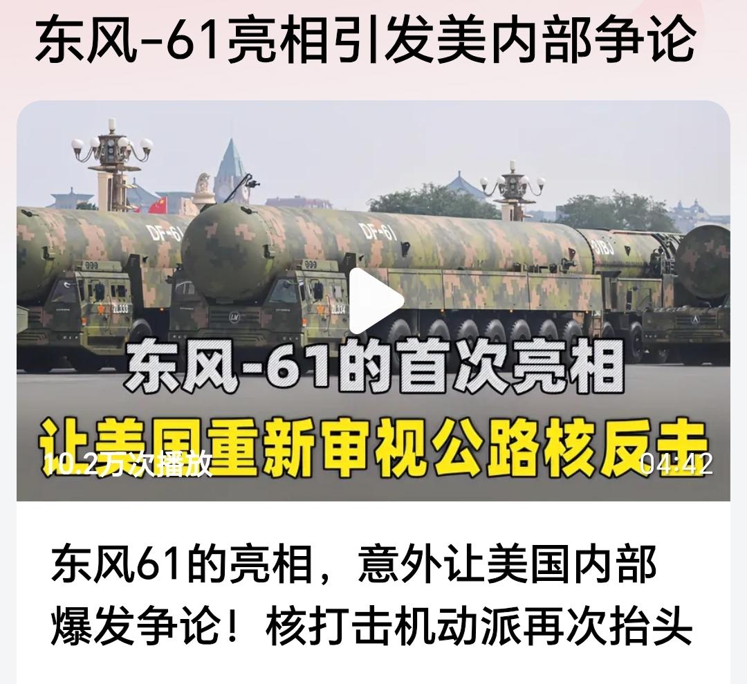 东风61这有啥让美国争论的。不是说成年人不做选择全都要吗?你看我们就是。有公路机动的东风61也有发射井的东风31BJ和东风5C。 难不成他们在争论高教授关于东风61的解读?60颗原子弹+1颗氢弹所以叫东风61。 这个嘛,就不好说了。也许真就是这样安排的。 你们的民兵3用了这么些年了,还是区小队县大队,都没有成为正规军啊。你看你们要搞的哨兵现在都没有搞好。我们的东风可是吹过好几轮了。 我打61,你跟不跟?[吃瓜群众] 点右上角关注我,我们一起去看这个魔幻的世界