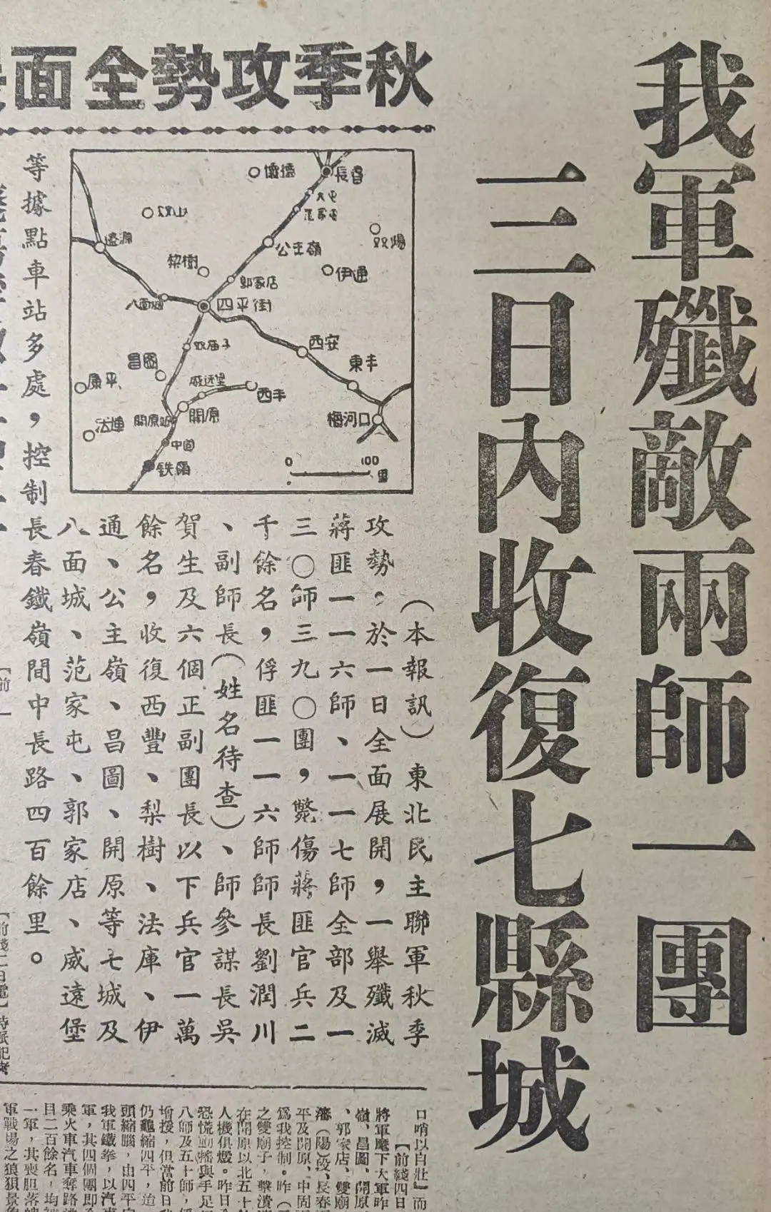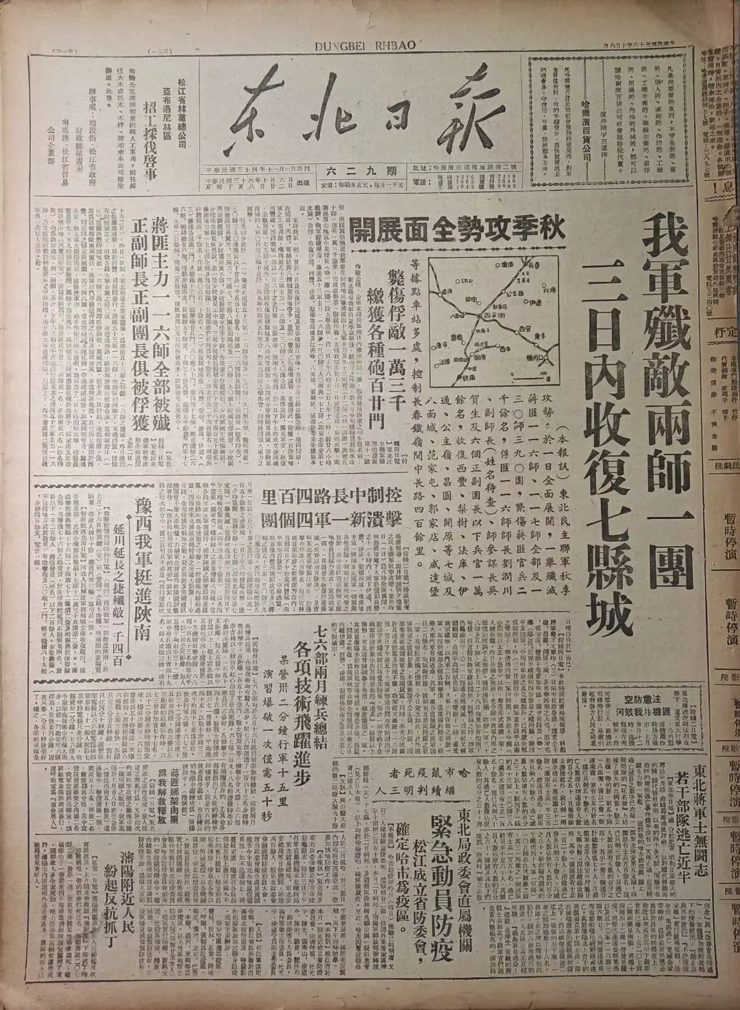老报上的今天---七十八年前的1947年10月6日《东北日报》头版头条报道:我军歼敌两师一团,三日内收复西丰、梨树、法库、伊通、公主岭、昌图、开原等七城。