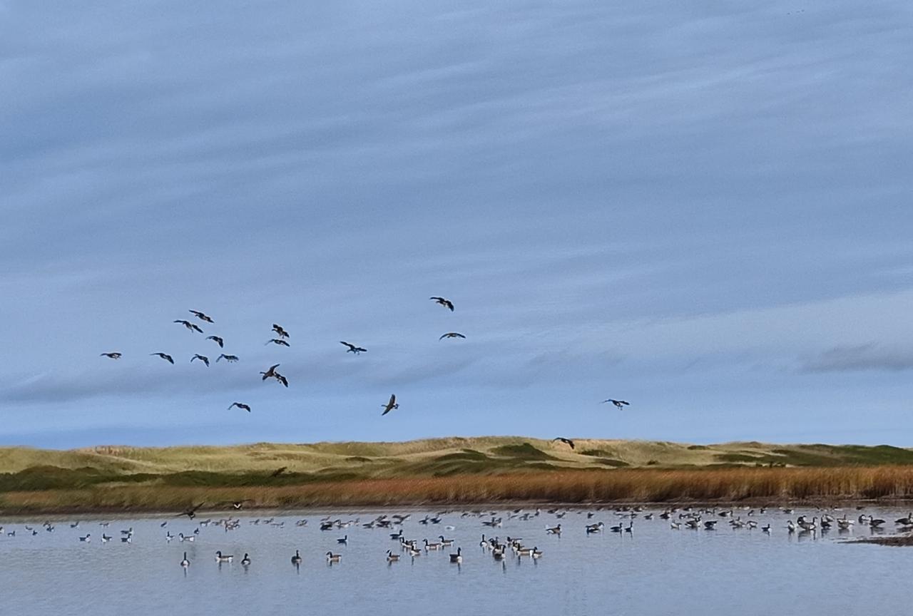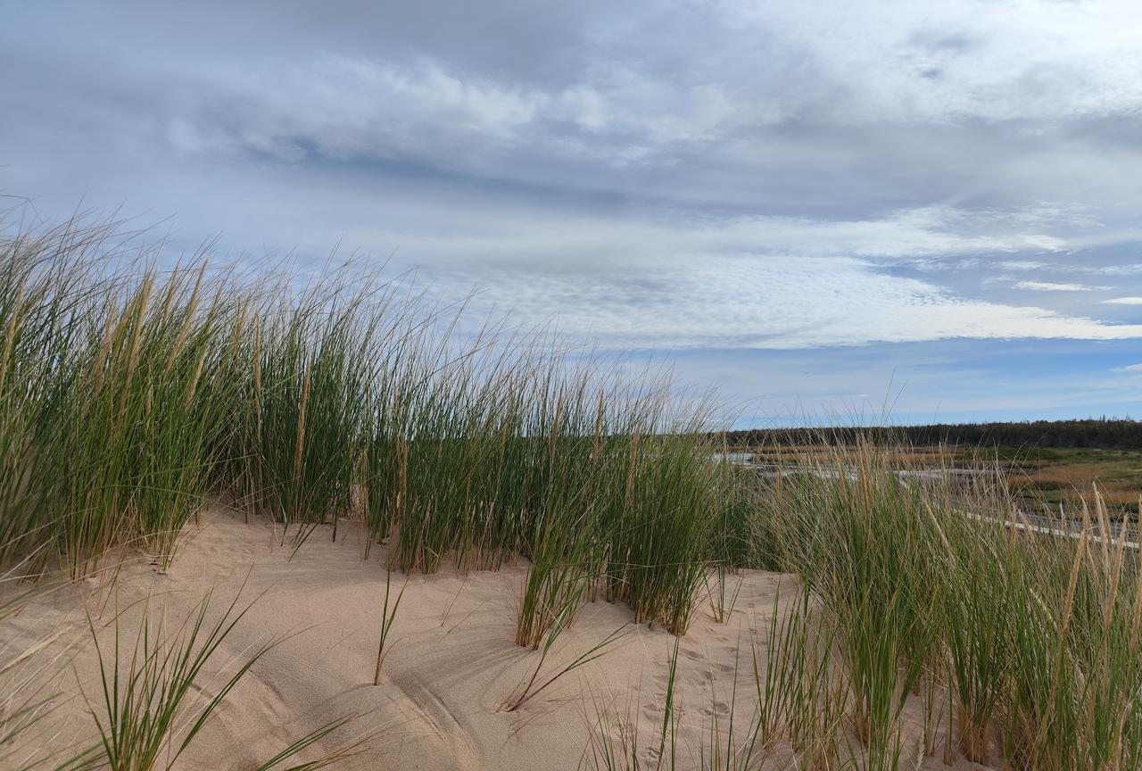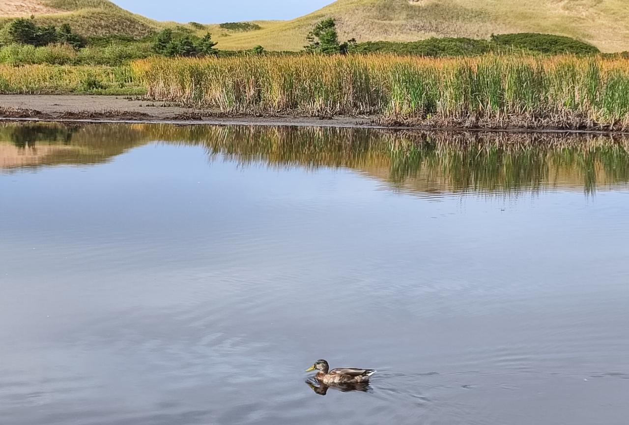 爱德华王子岛近距离观看加拿大鹅。 孩子驱车近两个小时赶到一处湿地,天空中不停地呼啸着飞来一群群加拿大鹅,我以为是大雁,因为也是排着队形飞翔。 这处湿地应该是他们的聚集栖息地。 老外说加拿大鹅很凶,别招惹。 咱就不是招惹的人是吧,不可能逮回家炖汤的。 看过加拿大鹅,往前一点儿是处沙丘,我猜测是沙漠,老外说是海边儿的海沙被风吹过来的。哦哦哦,果不其然,翻过沙丘就是一望无际的大海,那感觉真的是心胸豁然开朗。 原本孩子说这个地方好多小兔子,可能是我们来的晚了些,几个游客带着小狗吓到小兔子了吧,直到走出湿地都只看到小松鼠和野山鸡,一只兔子也没见到。