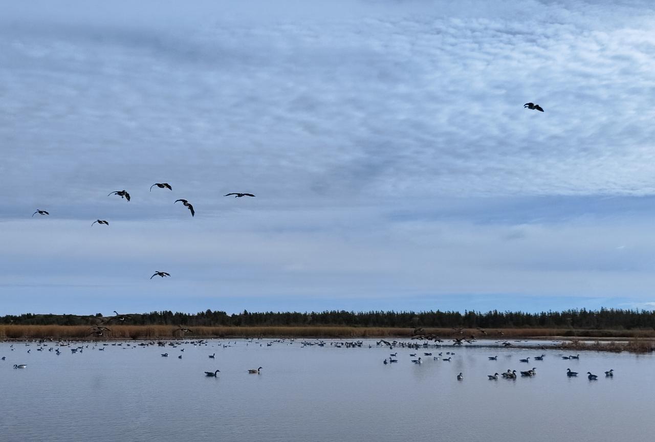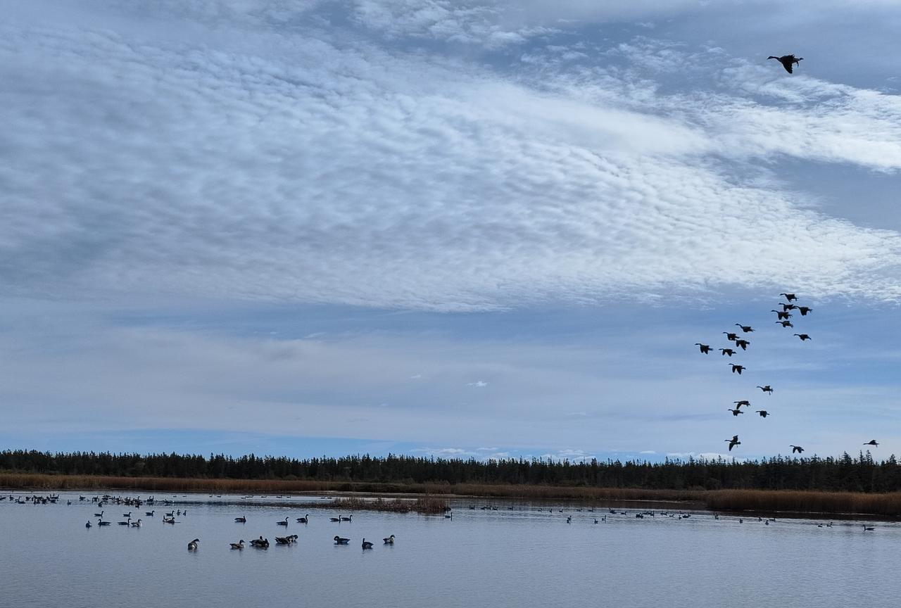 爱德华王子岛近距离观看加拿大鹅。 孩子驱车近两个小时赶到一处湿地,天空中不停地呼