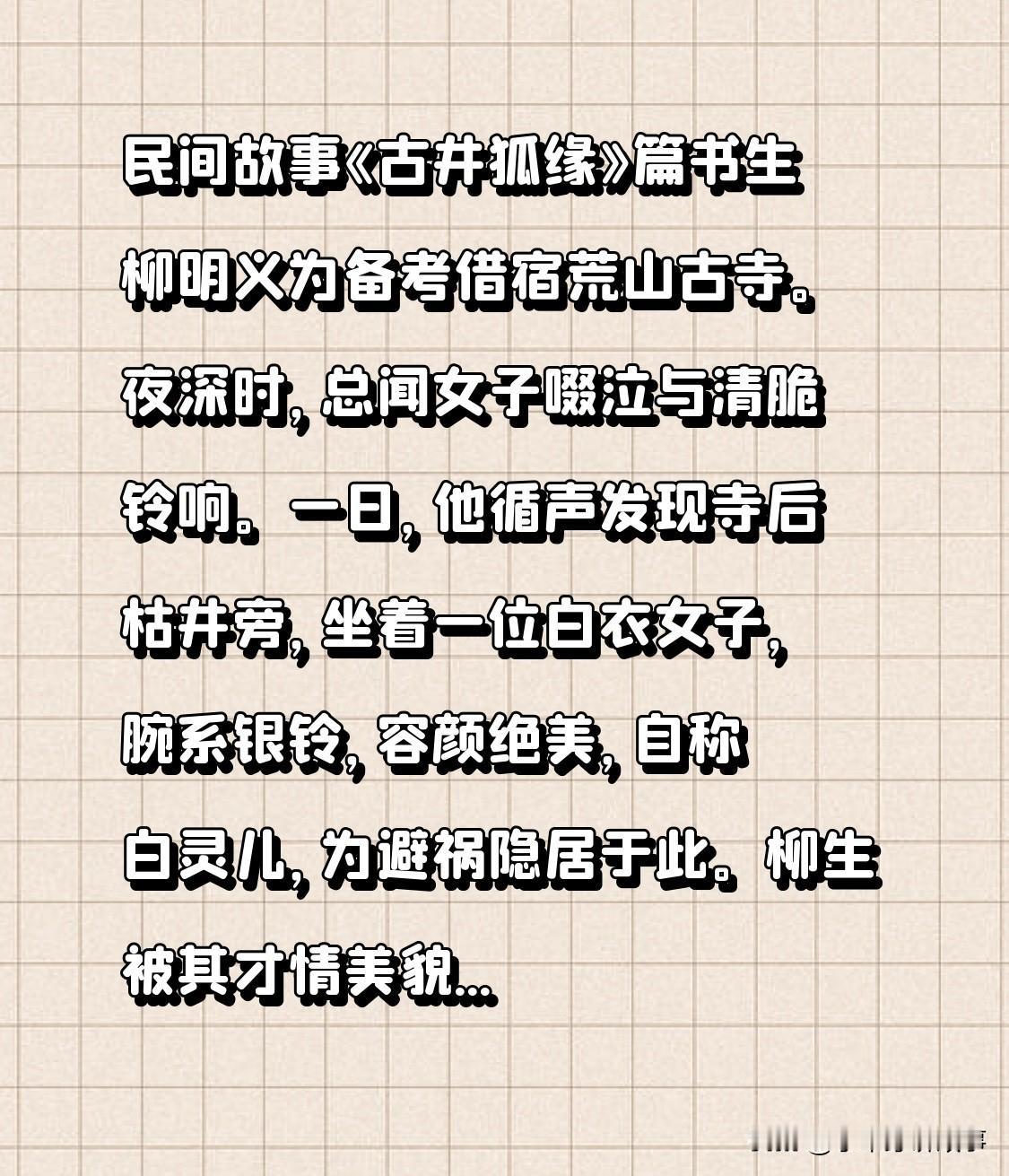 民间故事《古井狐缘》 书生柳明义为备考借宿荒山古寺,夜深常闻女子啜泣与铃响。一日,他循声见枯井旁白衣女子白灵儿,腕系银铃,美貌才情令他倾心,二人情愫渐生。 但柳生日渐消瘦恍惚。游方道士称他被妖物所缠,柳生不信。当夜,他见白狐吐纳,狐腕有银铃。白狐称曾渡他元气损了道行。 道士持剑闯入,白灵儿不避。柳生挡在她身前护她,道士收剑离去。白灵儿身影渐淡,留下银铃消失,柳生怅然若失。
