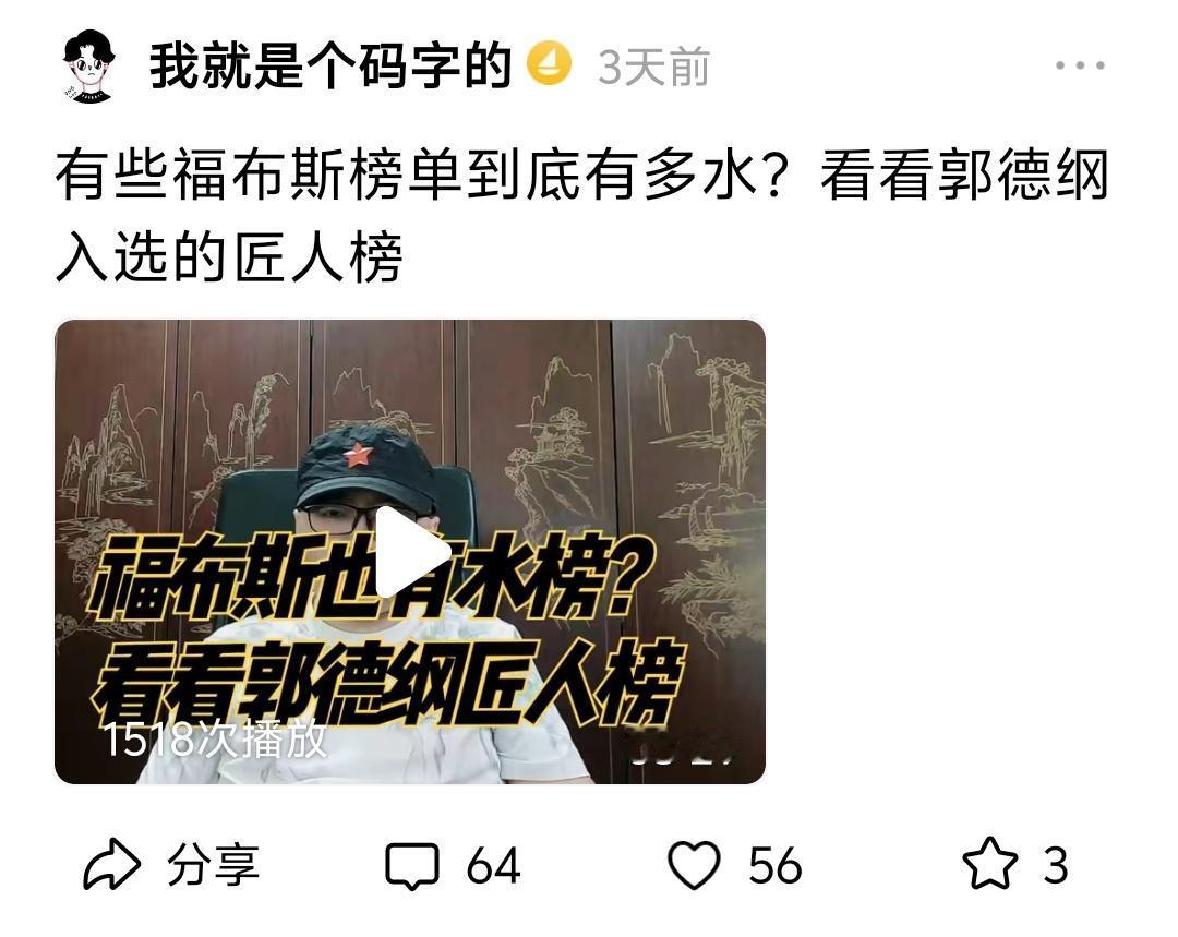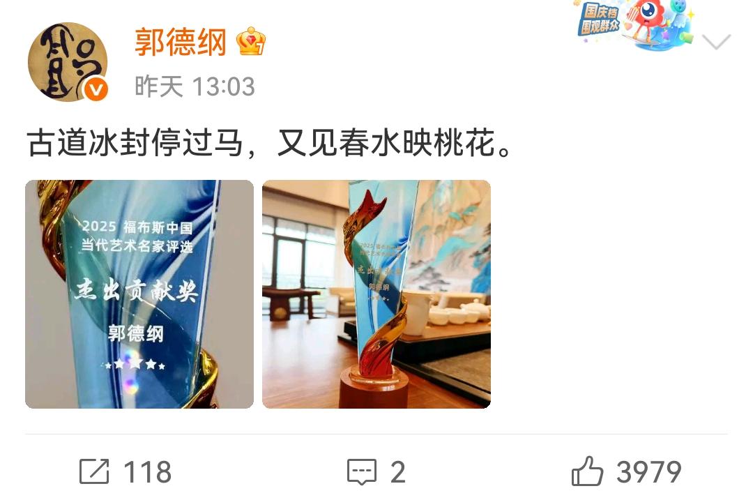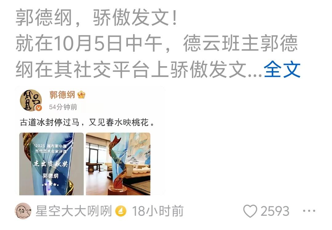 郭德纲晒福布斯奖的手法很奇怪。 早在一周前,网上就有了郭德纲获得2025年福布斯中国当代艺术名家评选“杰出贡献奖”的消息,支持者们好一通造势捧高,批评者则对奖项含金量提出质疑并做深入论证。可令人奇怪的是,当事人郭德纲却连着多日都未公布相关消息,就好像此事不存在或极其难为情似的。 直到一周后的10月5日,郭德纲终于在围脖上晒出奖杯图片,并配文“古道冰封停过马,又见春水映桃花”。 啥意思?这词听着耳熟,字面意思也明白,可是出处和具体语境是什么呢?上网一查才明白,原来是出自何悠悠演唱的歌曲《众里寻他》,词意是描写苦苦追寻的爱情。郭德纲大概是借此表达对这个奖项的渴望与期盼,最终春水荡漾、桃花倒映的得尝所愿吧。 只是既然郭德纲如此看中此奖并最终获得,为何仅发布在传播度相对较少的围脖上,并且仅允许少许人评论,而不在头条和逗音平台发布、让更多人知晓和道喜呢?难道他只为体验一把“锦衣夜行”的乐趣?还是说认为不便于大面积传播此消息呢? 聪明的网友们,您觉得郭德纲此番操作是基于什么考虑呢?郭德纲 德云社 为什么郭德纲争议如此多 郭德纲的品德如何?