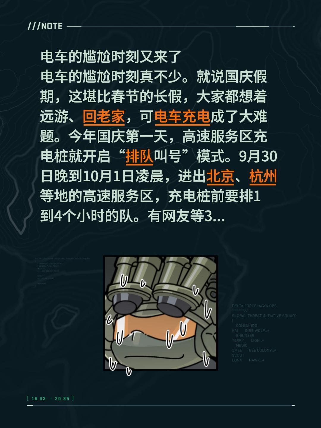 电车的尴尬时刻又来了 电车的尴尬时刻真不少。就说国庆假期,这堪比春节的长假,大家都想着远游、回老家,可电车充电成了大难题。今年国庆第一天,高速服务区充电桩就开启“排队叫号”模式。9月30日晚到10月1日凌晨,进出北京、杭州等地的高速服务区,充电桩前要排1到4个小时的队。有网友等3个小时才充上电,这就像把吃饭排队模式搬到充电上。但吃饭等不及还能去路边摊,电车充不上电可没别的办法“将就”。还有更尴尬的,充电桩就在眼前,却够不着,这焦虑感一下就上来了。新能源车渗透率都快和燃油车平分天下了,充电问题却还这么严重,实在让人无奈。 @