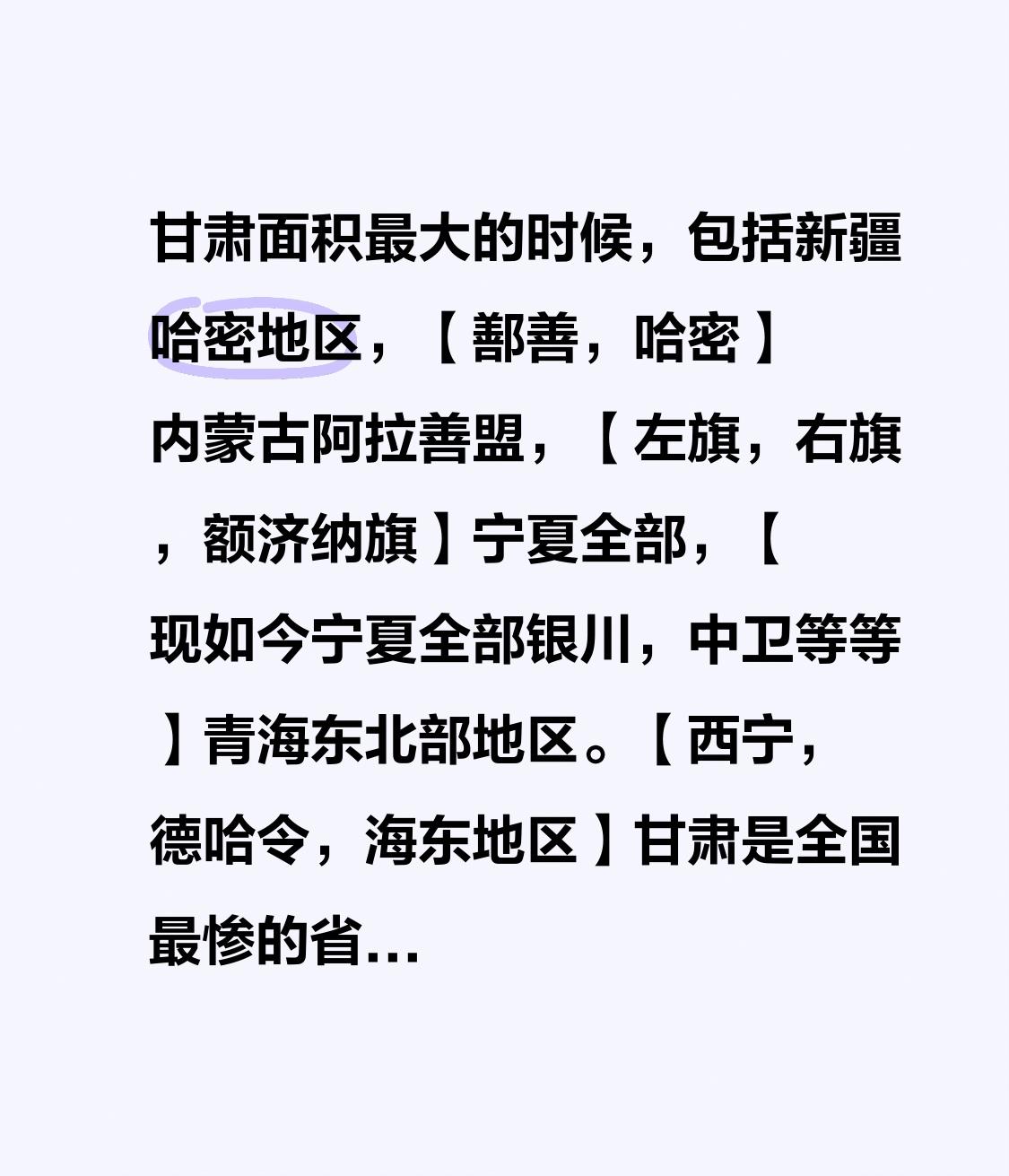 甘肃面积最大之时, 涵盖新疆哈密地区,【鄯善,哈密】 内蒙古阿拉善盟,【左旗,右旗,额济纳旗】 宁夏全境,【即如今宁夏的银川、中卫等地】 青海东北部地区。【西宁,德哈令,海东地区】 甘肃曾是全国颇为“悲催”的省份之一,被硬生生分割出几个省市地区。 原本地域广袤,却惨遭瓜分。