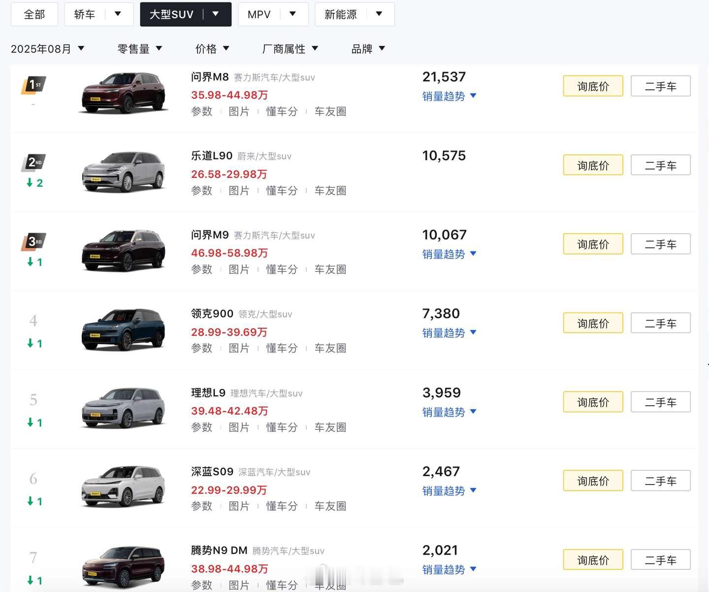 而8月的大型SUV市场销量排行,更是难以寻觅到传统豪华品牌的身影。