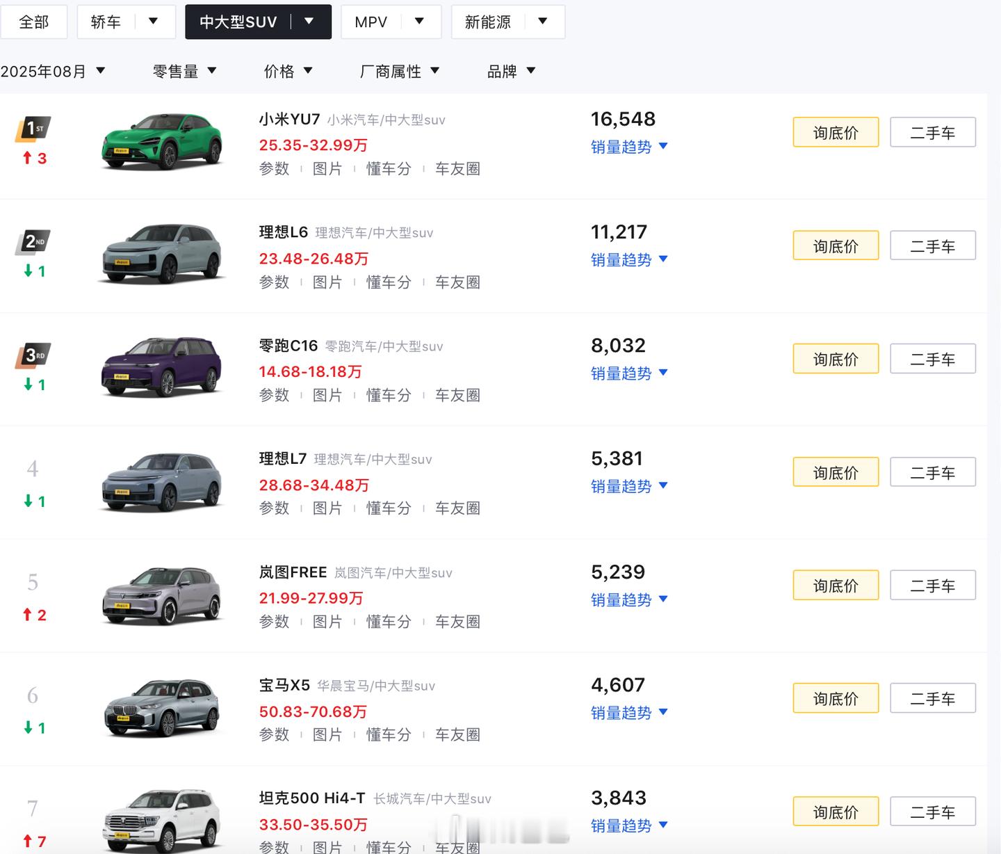 2025年 上半年数据显示,在30-40万元价位区间,中国品牌和传统豪华品牌的市场份额已经各半;而在40-50万元价位区间,中国品牌的份额更是接近65%,传统豪华品牌的份额仅剩35%。8月的中大型SUV销量榜,只有宝马X5,4607台。