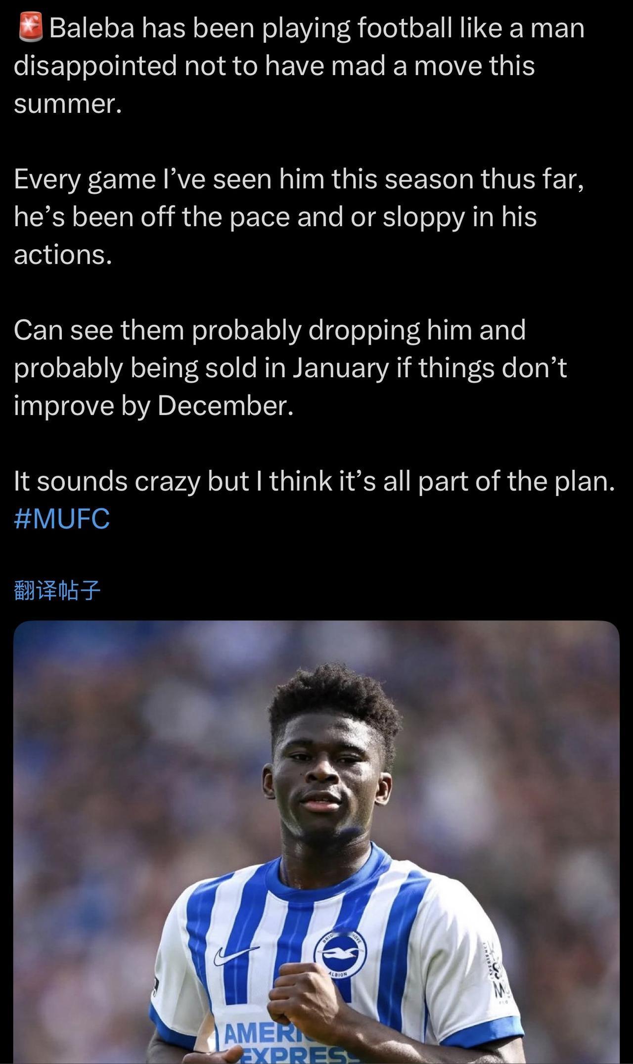 媒体认为:巴莱巴在故意摆烂,逼布赖顿在冬窗卖掉他。 🔵会不会曼联买了他,他也就这样的水平[呲牙][呲牙][呲牙][呲牙][呲牙][呲牙][呲牙][呲牙][呲牙] 🔴巴莱巴踢足球的样子就像一个对今年夏天未能转会感到失望的人。 🔴本赛季到目前为止,我看过他的每一场比赛,他都表现得节奏不够,或者动作马虎。 🔴如果到 12 月情况还没有好转,他们可能会放弃他,并可能在 1 月份将他卖掉。 🔴这听起来很疯狂,但我认为这都是计划的一部分。