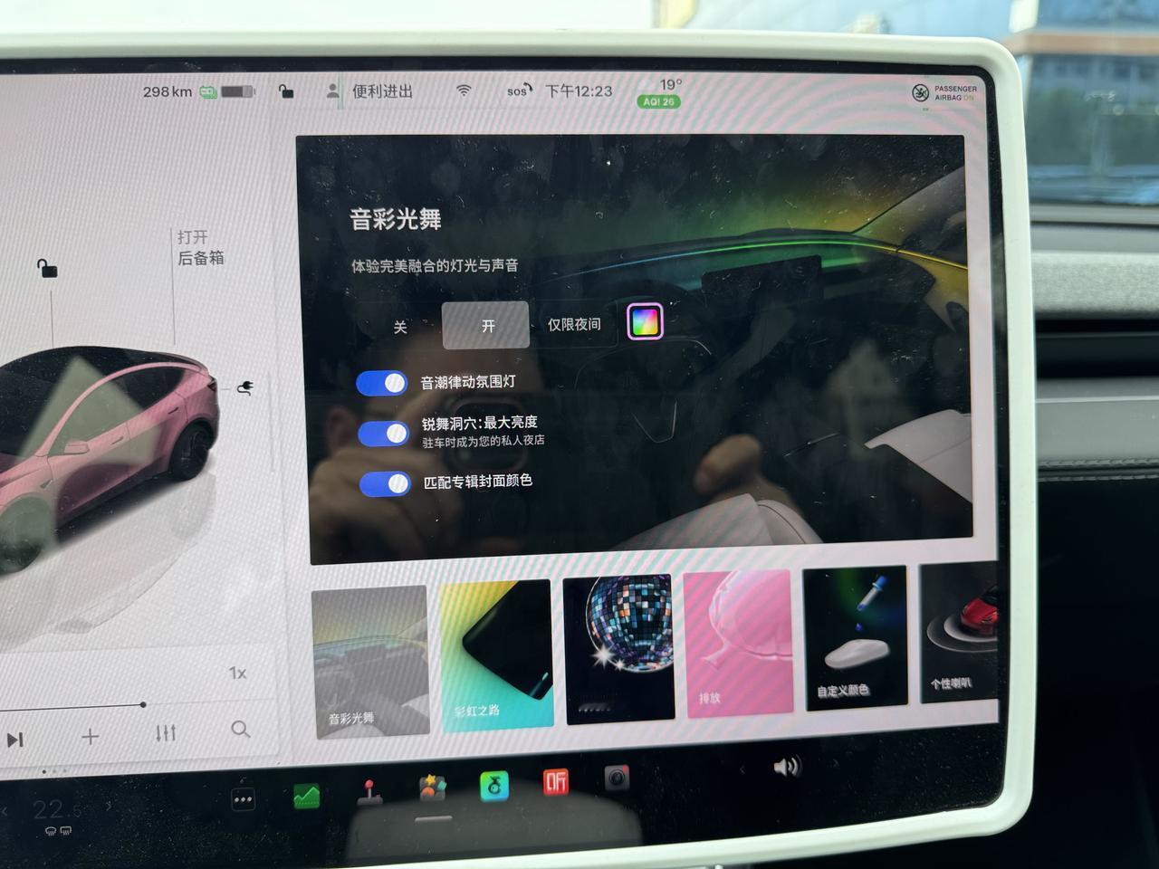 特斯拉2025.25.11最新版本大家都更新了吧,新增的这个功能还真不错。 音彩光舞功能,车上的氛围灯终于用上了,会随着播放音乐,闪烁。太炫酷了!说话的声音也可以影响氛围灯闪烁。 还可以实现锐舞洞穴,晚上开启可以达到灯光最大亮度。