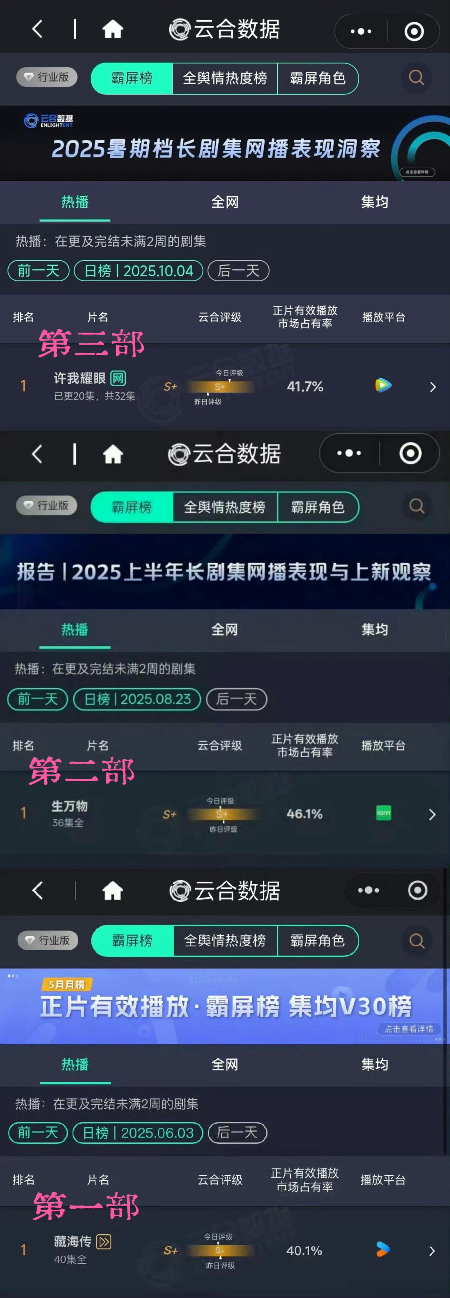 2025年云合单日破40%剧集:藏海传、生万物、许我耀眼 。[鼓掌][鼓掌][鼓掌][彩虹屁][彩虹屁][彩虹屁]