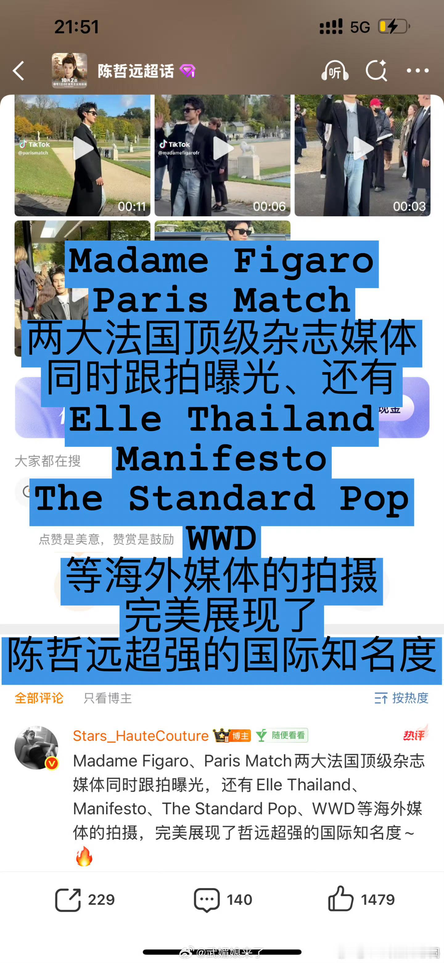 陈哲远巴黎首秀即登泰国、马来西亚趋势,获法、新等多国媒体跟拍。海外媒体称赞他展现超强国际知名度,这是“为国争光”!