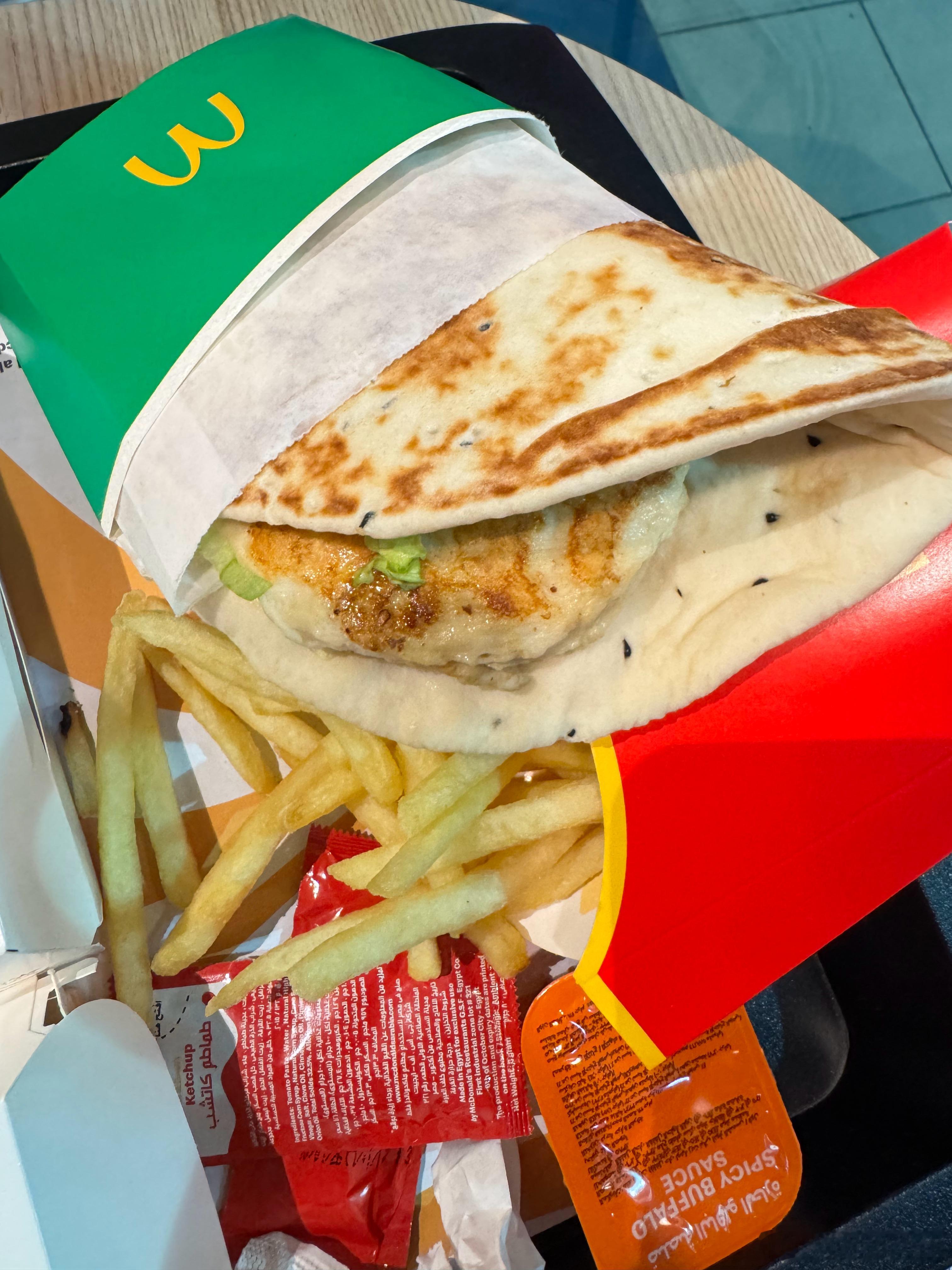 遇到好心的麦当劳店员看不下去,帮我们想办法,经过和巴基斯坦司机几番理论,最后她用了自己的钱给我们支付!!软件显示17迪拉姆,最后司机看有现金了改口说因为耽误了他时间,现在要38迪拉姆……这可能是麦当劳店员半天的工资,为了感谢我们想买点东西给她,她表示是帮我们不需要任何