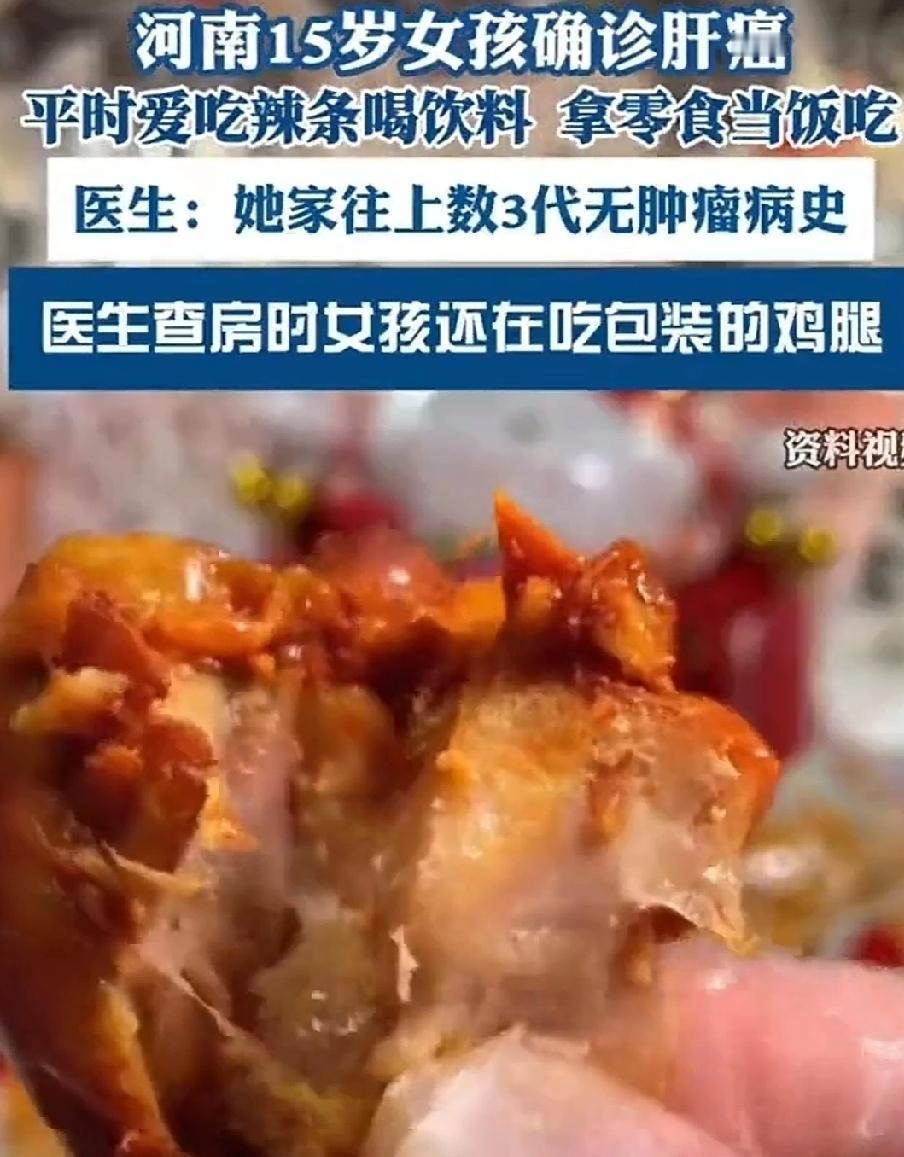 近日,河南郑州。15岁的女孩因右侧腹部疼痛,到郑州大学第一附属医院检查。发现女孩肝脏上有直径十几厘米的恶性肿瘤,被安排住院治疗。 经了解,女孩唯一的爱好是吃零食,辣条、饮料是她的最爱,常常不离口,以至于拿零食当饭吃。她住院了,这个习惯还没改掉,医生查房时,她还在啃包装的鸡腿。 “病从口入”这是老祖宗几千年来总结出来的至理名言。零食以它携带方便,口感好,深受孩子们的欢迎。但零食高盐、营养单一,高脂和各种各样的添加剂、把它当饭吃,就会影响身体健康。 家长溺爱孩子,放任孩子,让孩子养成不良习惯,实际上是在害孩子。 家长应该重视孩子的饮食习惯,把好“病从口入”这一关,让孩子健健康康的成长。 15岁女孩拿零食当饭吃确诊肝癌零食孩子成长