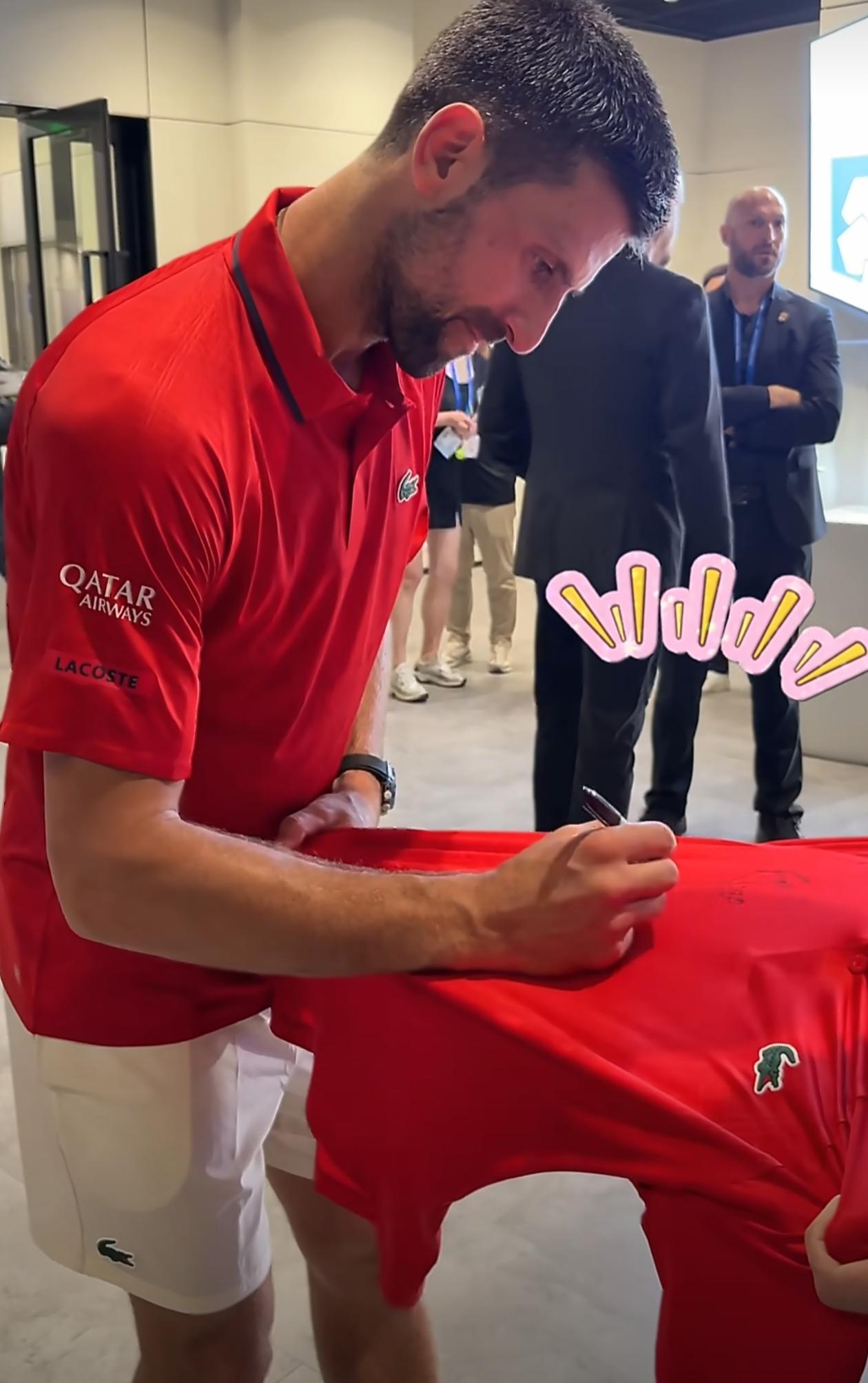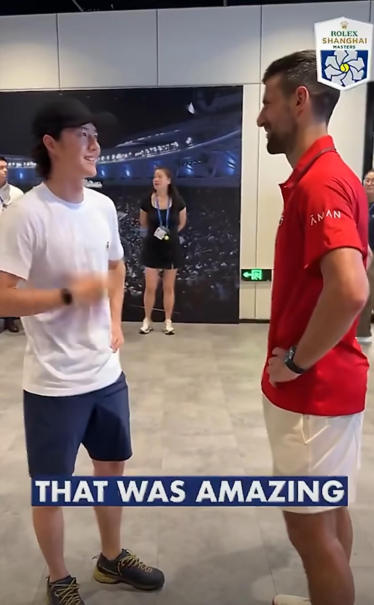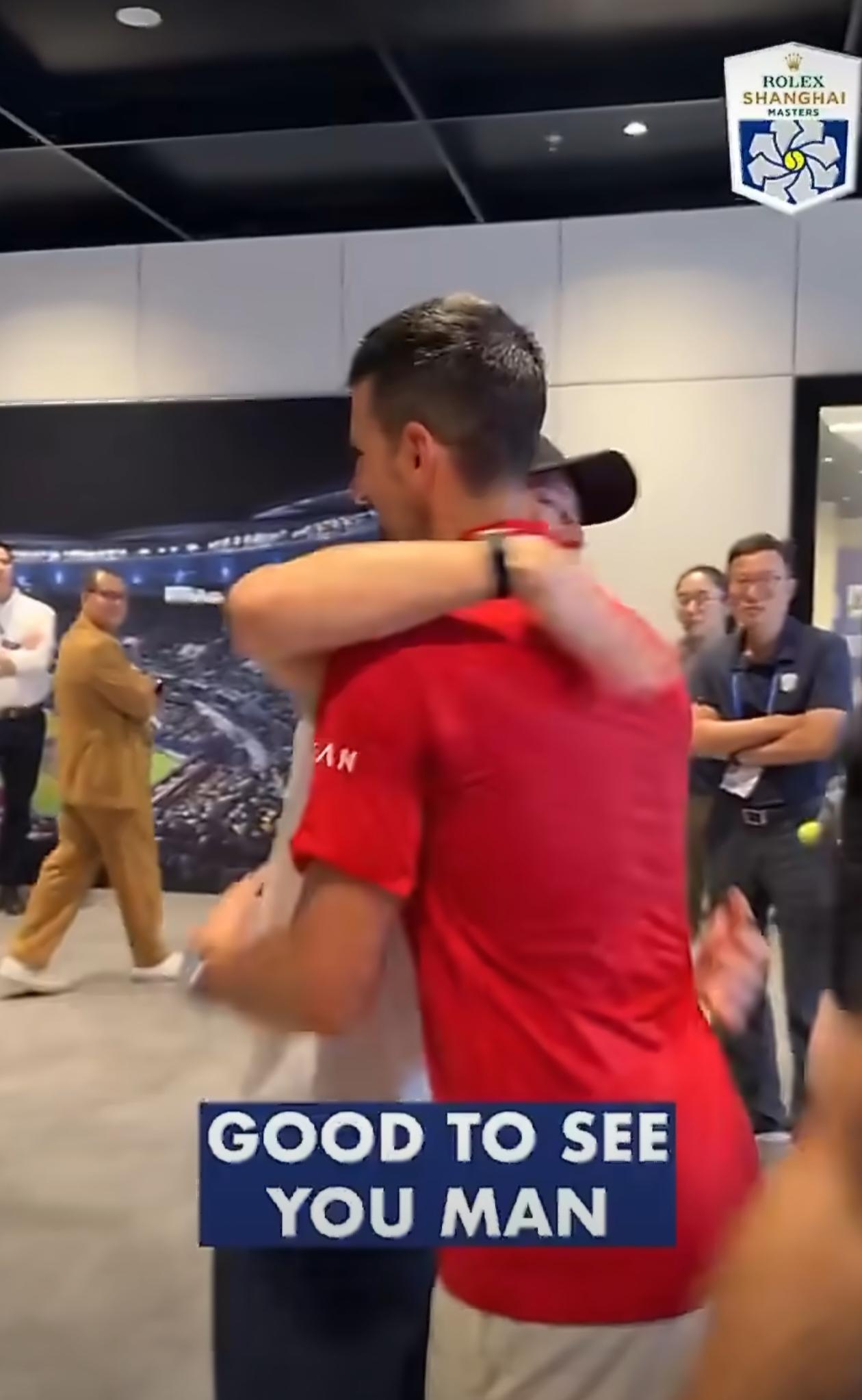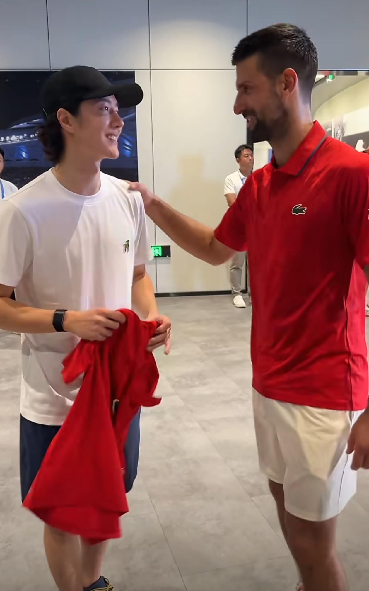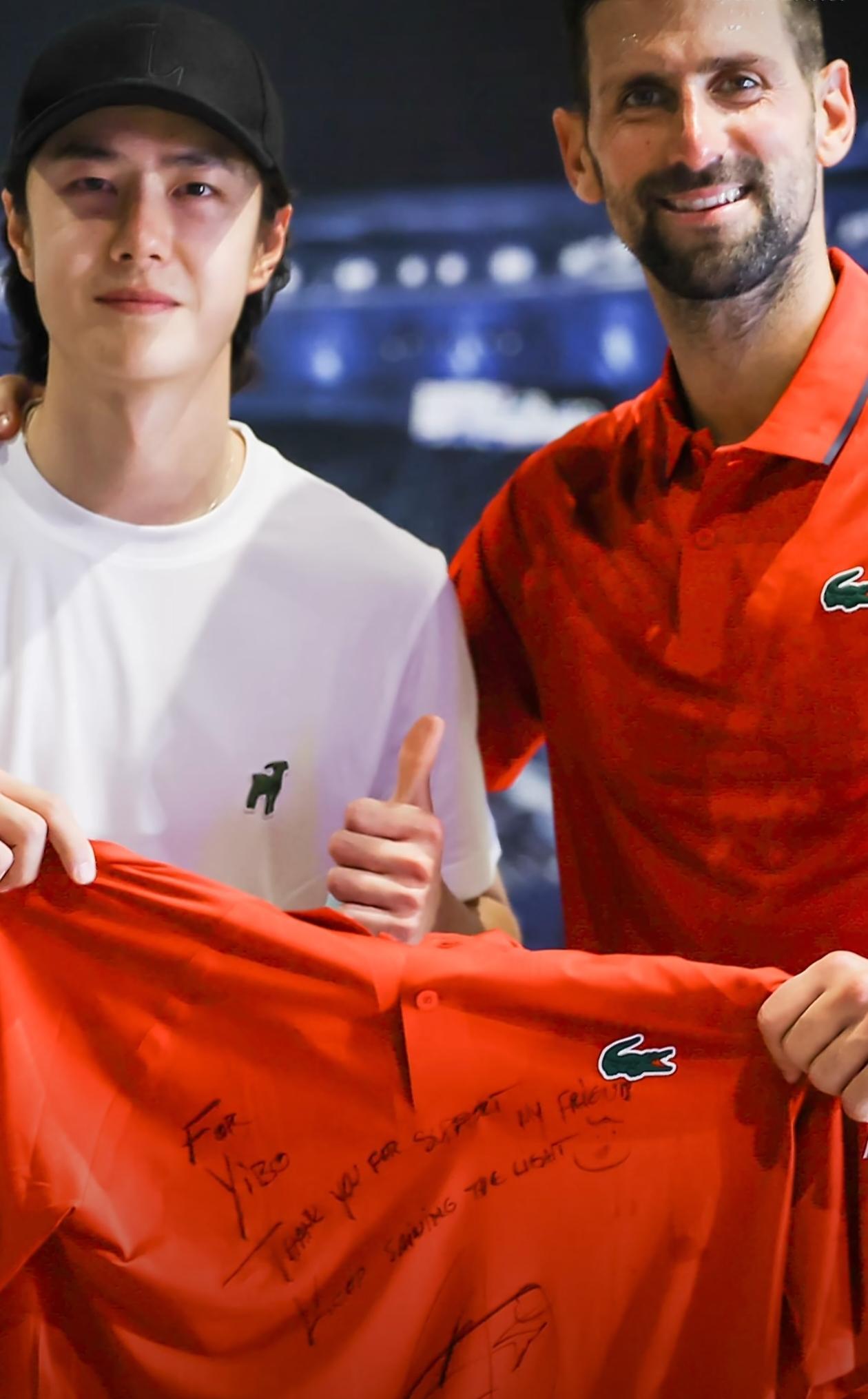 【#王一博德约拥抱#】#德约签名王一博嘻嘻# @UNIQ-王一博 现身@上海劳力士大师赛 ,为好友德约科维奇现场打call!二人拥抱超温暖,德约送上签名t恤王一博笑超甜!