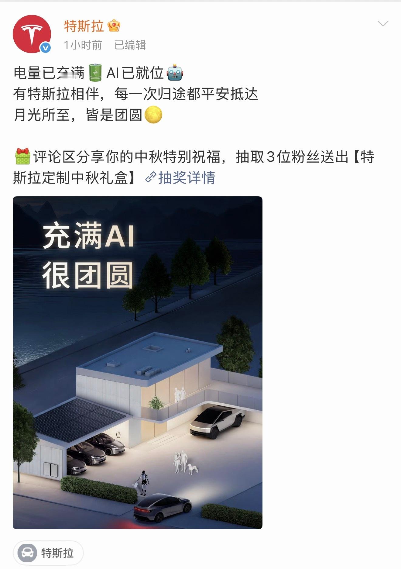 特斯拉X账号Tesla Asia发了中秋快乐的祝福,跟微博官号的图片一致,看来应该是中国团队制图,两者的区别是微博官方有互动礼物[doge]。