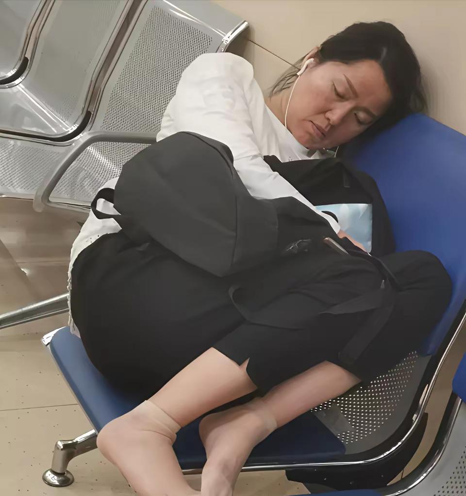 中秋佳节,无可奈何的坚守。 看的出她很疲劳,蜷缩在坐椅上睡着了,但也没多占座位,