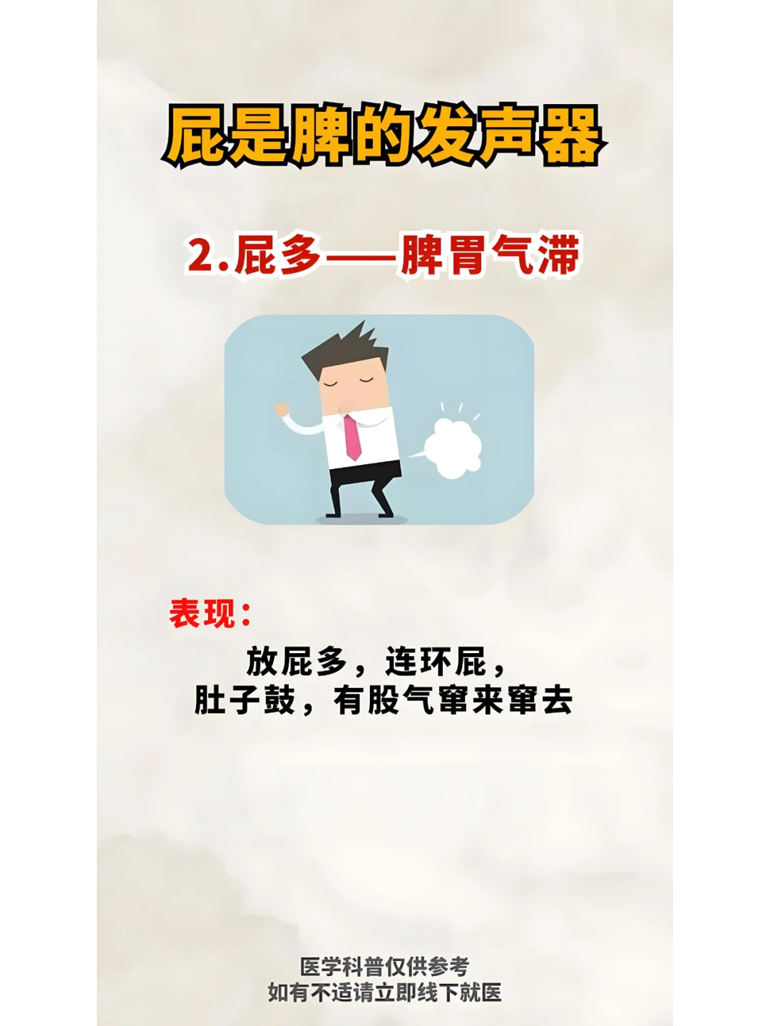 表现:放屁多、连环屁、肚子鼓,有股气窜来窜去。