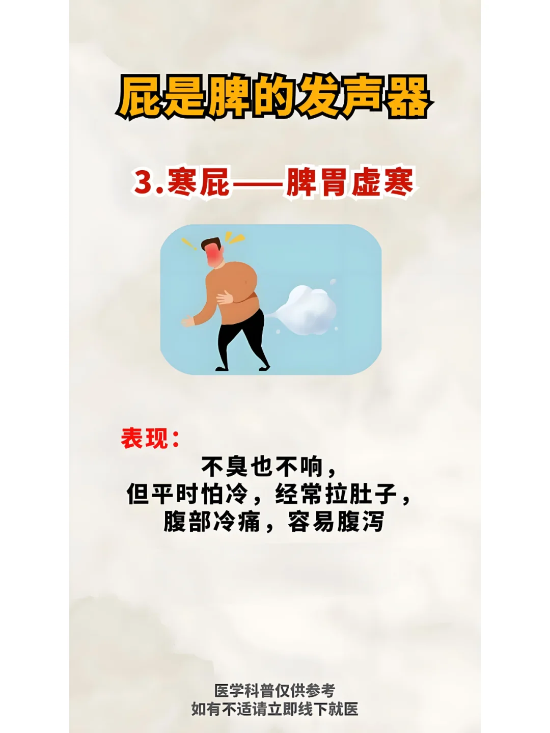 表现:不臭也不响,但平时怕冷,经常拉肚子,腹部冷痛,容易腹泻。