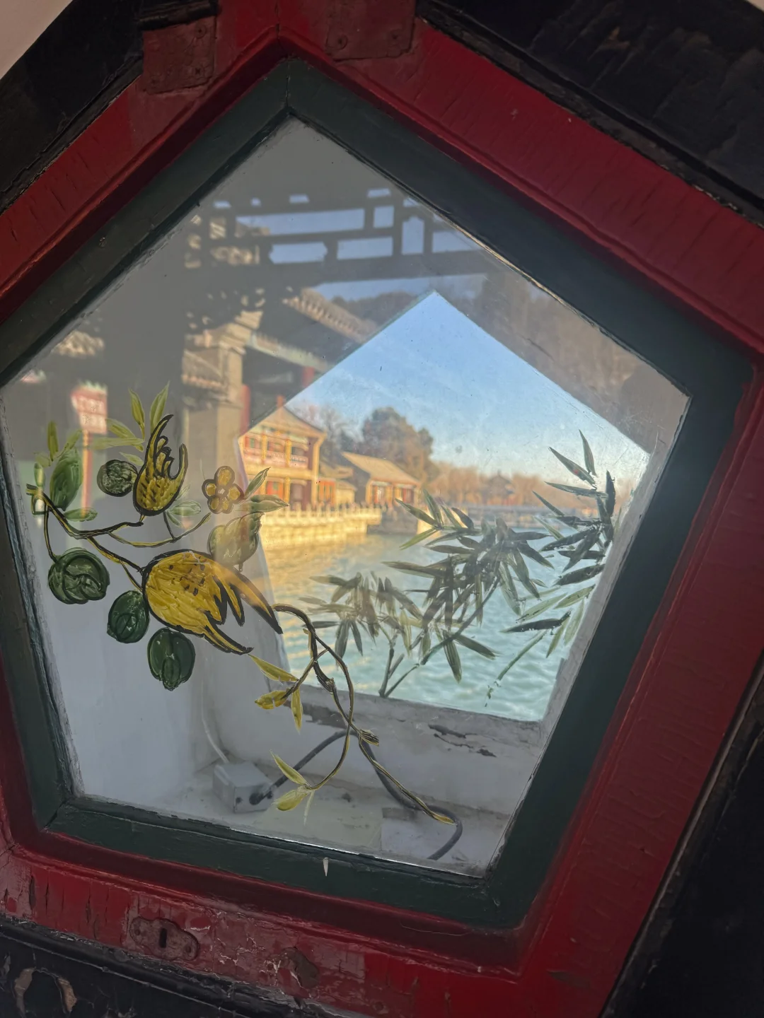 ❶❷窗花,乐寿堂附近,透过图案+形状各异的双层窗花看昆明湖,另一番景象!(图18)