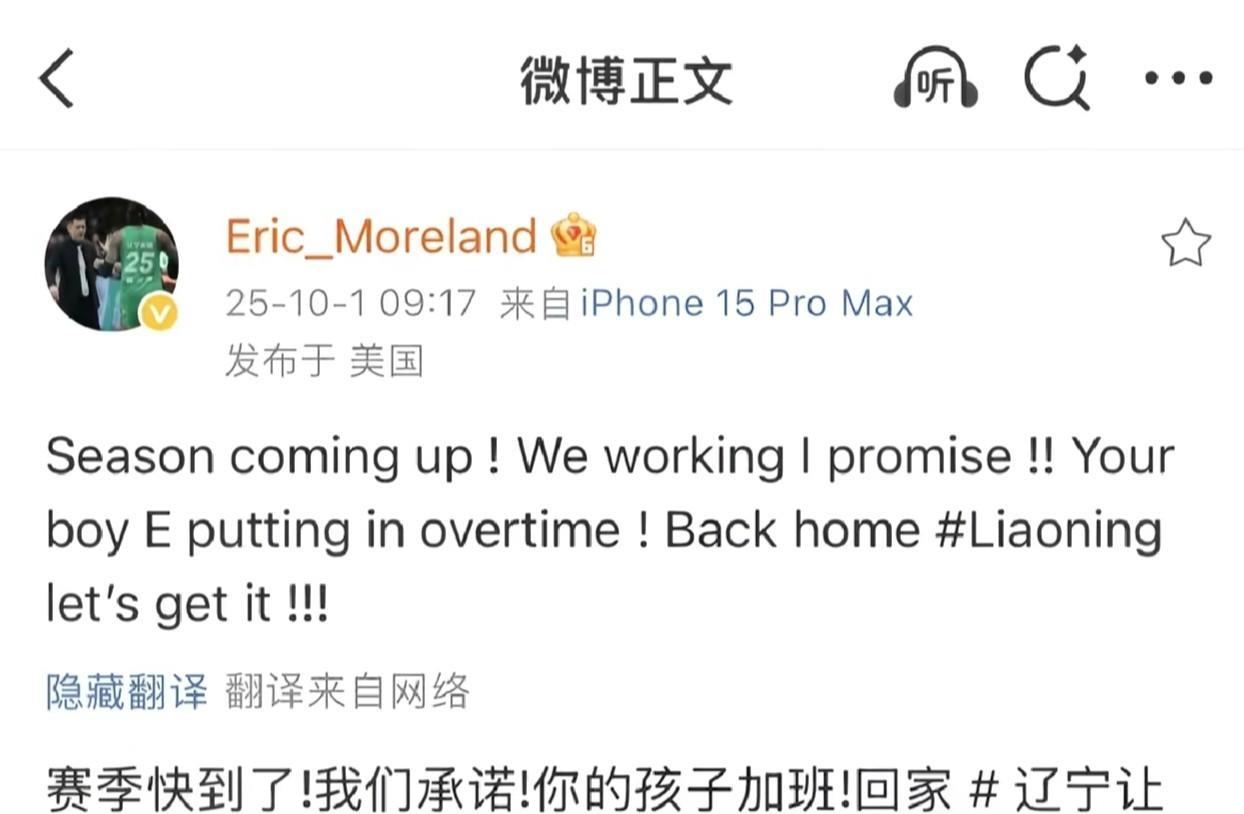 莫兰德估计还没知道吧! 近日,辽宁重新签回的功勋外援,莫兰德更新社媒,向俱乐部球