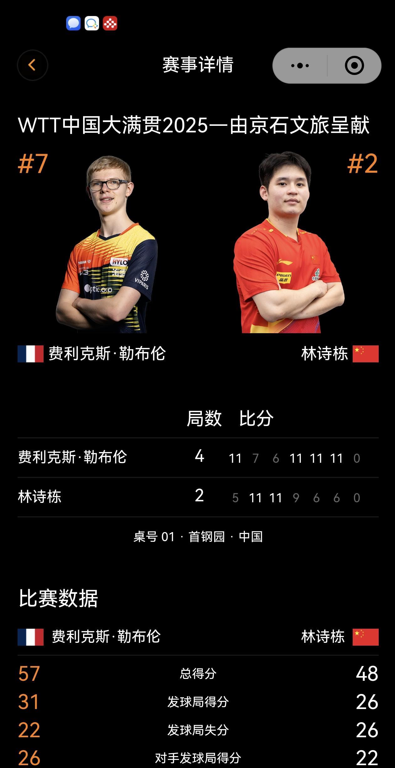 WTT北京大满贯2025,10.5正赛第8天午场:收官之战,或超出预想的比赛,男单半决赛,林诗栋2:4法国小布,向鹏3:4王楚钦,无缘冠亚军。 #王楚钦# #林诗栋# #中国大满贯#