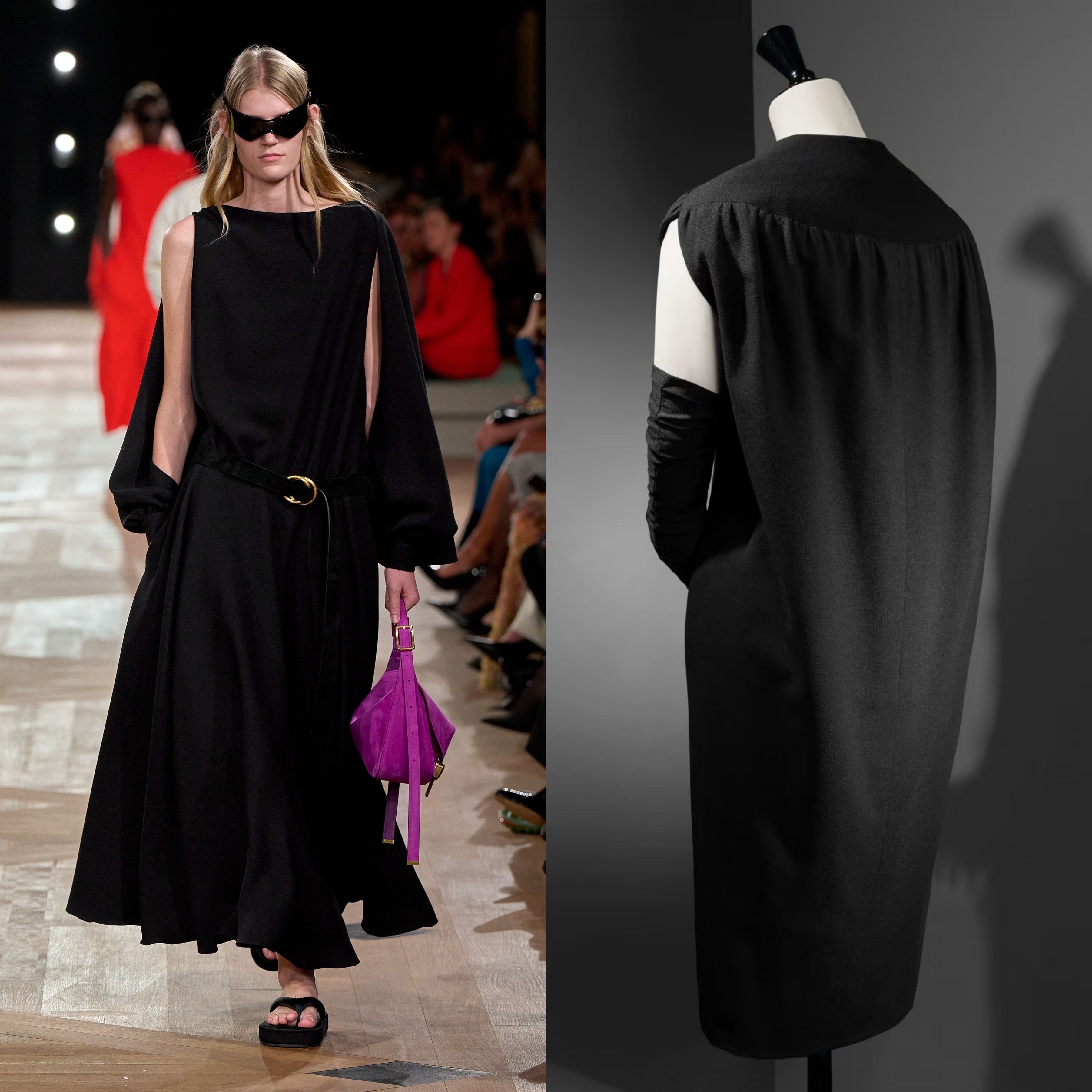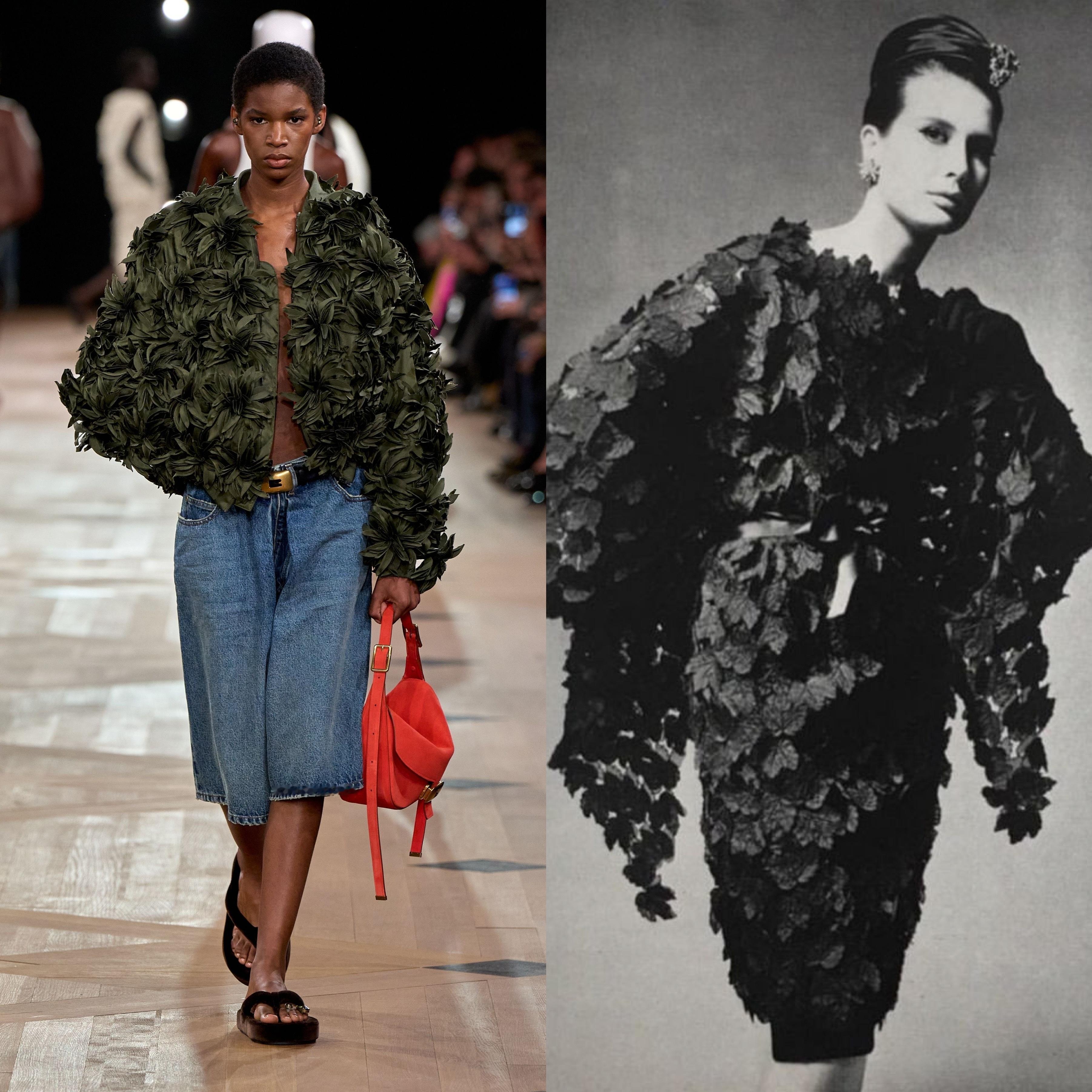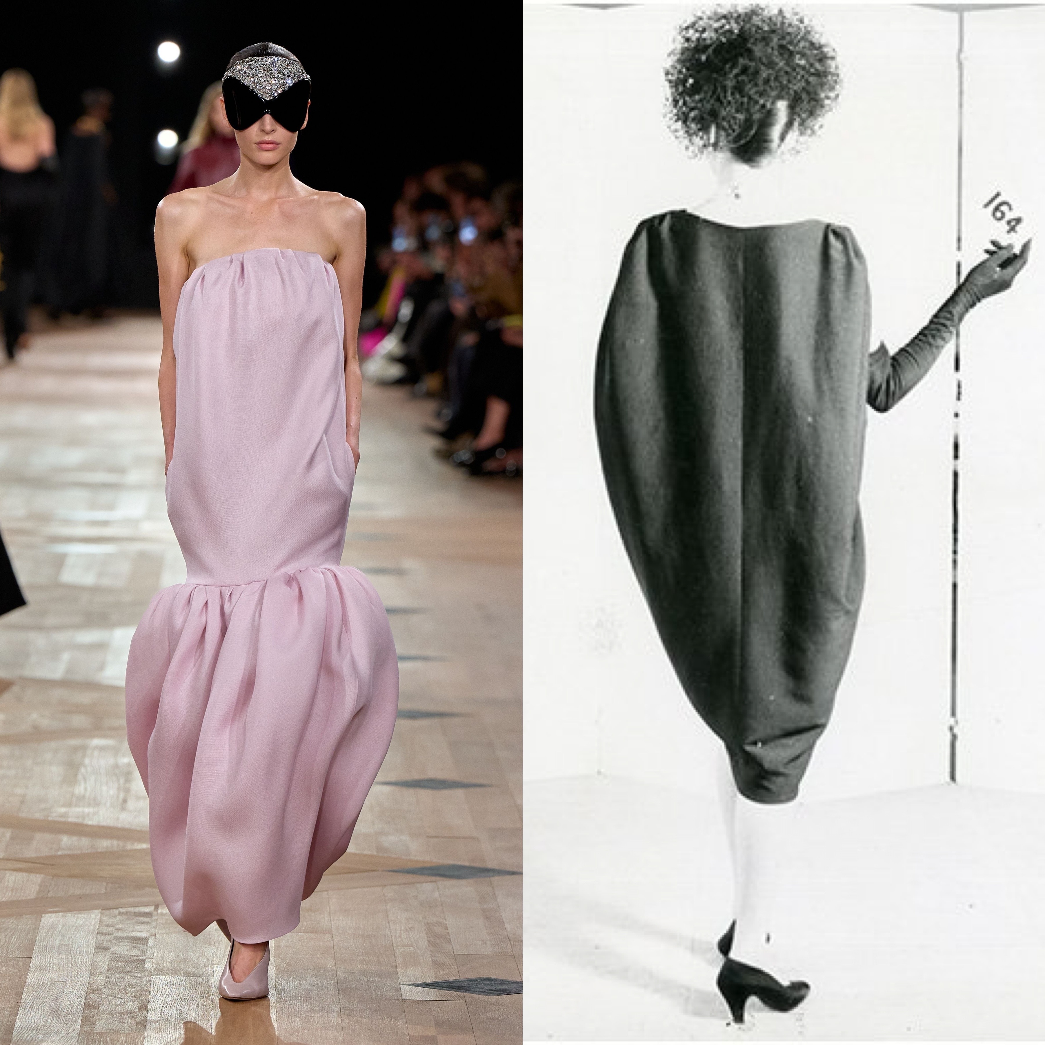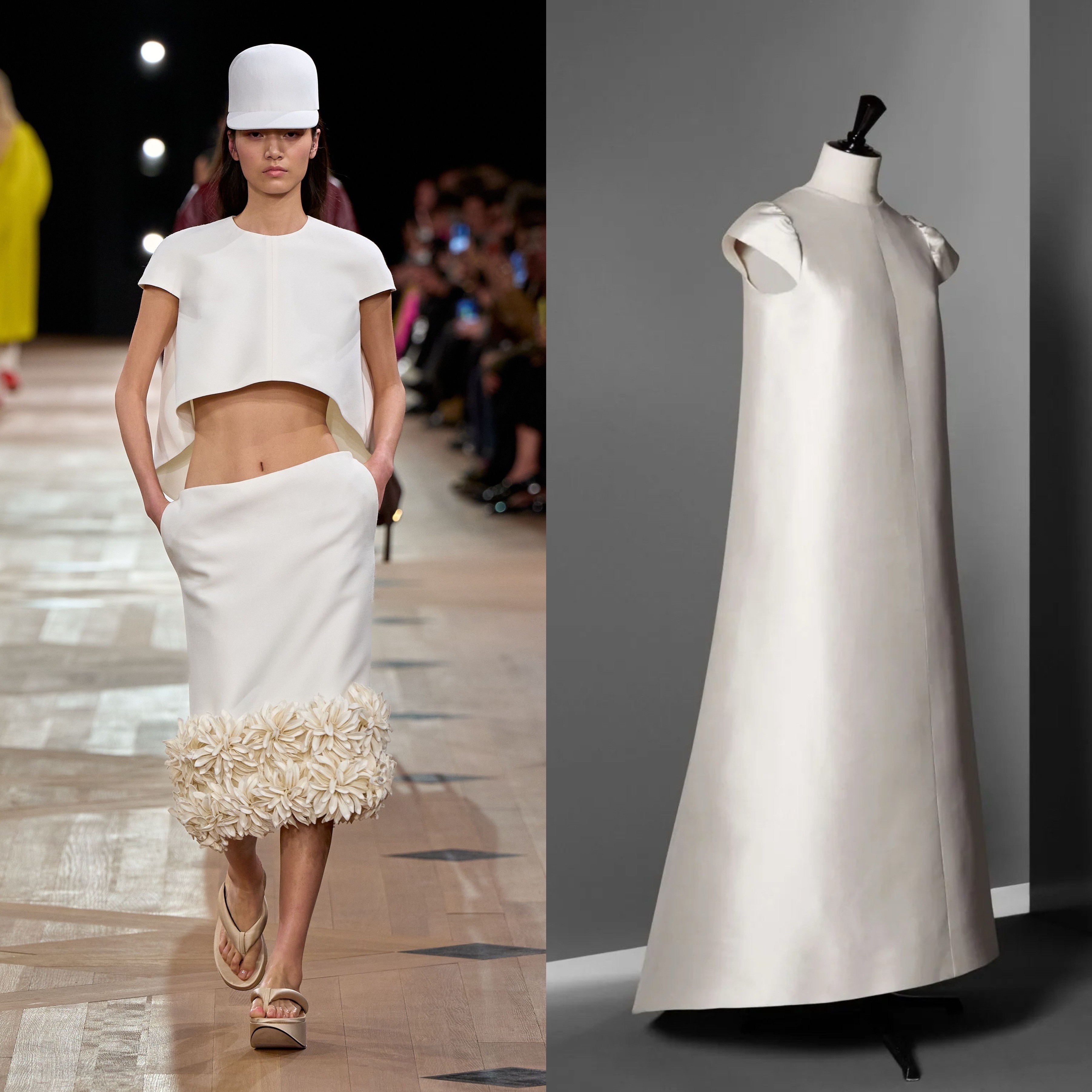 延续 Balenciaga 先生标志性的建筑感廓形与剪裁 ,在包括开场 、闭场在内多套 Look 都致敬了品牌 1958 年的Sack Dress ,以宽松而不失结构的现代裙装 ,重新诠释了对于服装空间感的独特理解 ;此外 ,1950 年代 Baby Doll 裙装 、1951 年的不对称层叠裙摆廓形 、1955 年的束腰设计 、1963年的立体花卉,这些出自创始人之手的经典设计元素在 Pierpaolo Piccioli 手下都被赋予了全新呈现 。值得关注的是 ,Nicolas Ghesquière 时期的标志性作品 ,如 2008 年春夏系列的花卉印花 ,以及 Demna 时期具有先锋怪诞基因的配饰 ,都被融入了本季设计语言 ,形成跨越品牌几代设计师的对话 。这种融合不仅体现在单品细节 ,更贯穿于整体系列的叙事逻辑 —— 从廓形到材质 ,每一件作品都在当代时装语境中延续着品牌的百年心跳 。