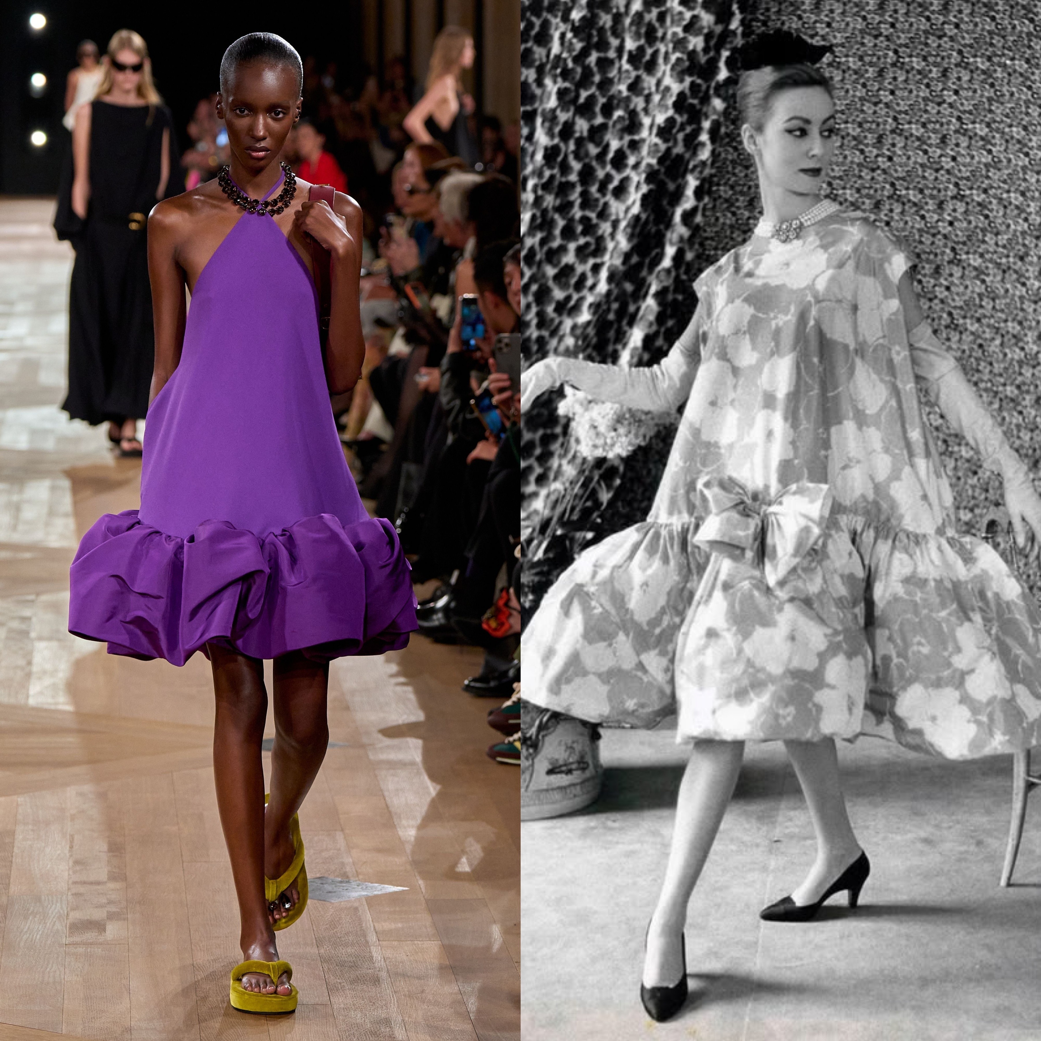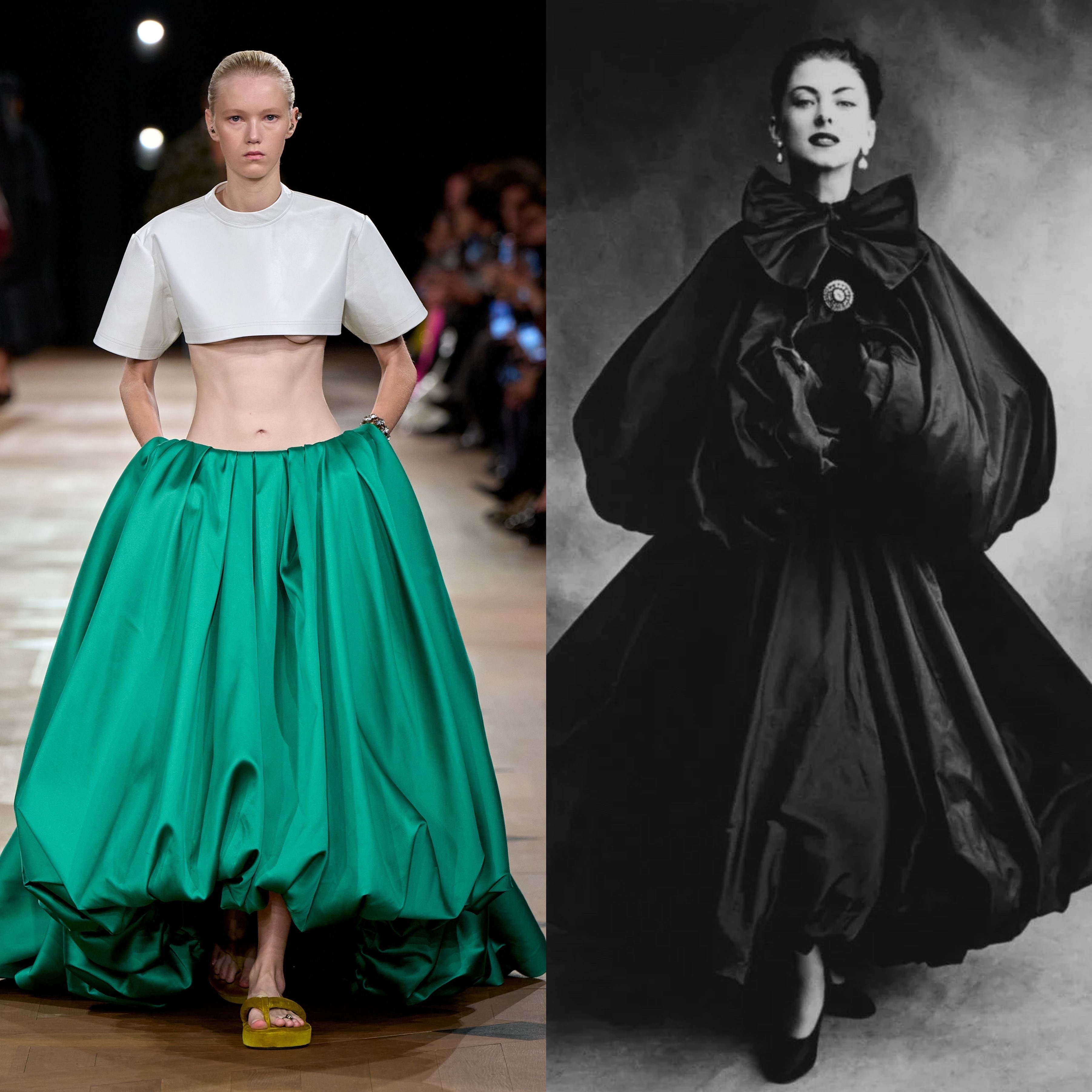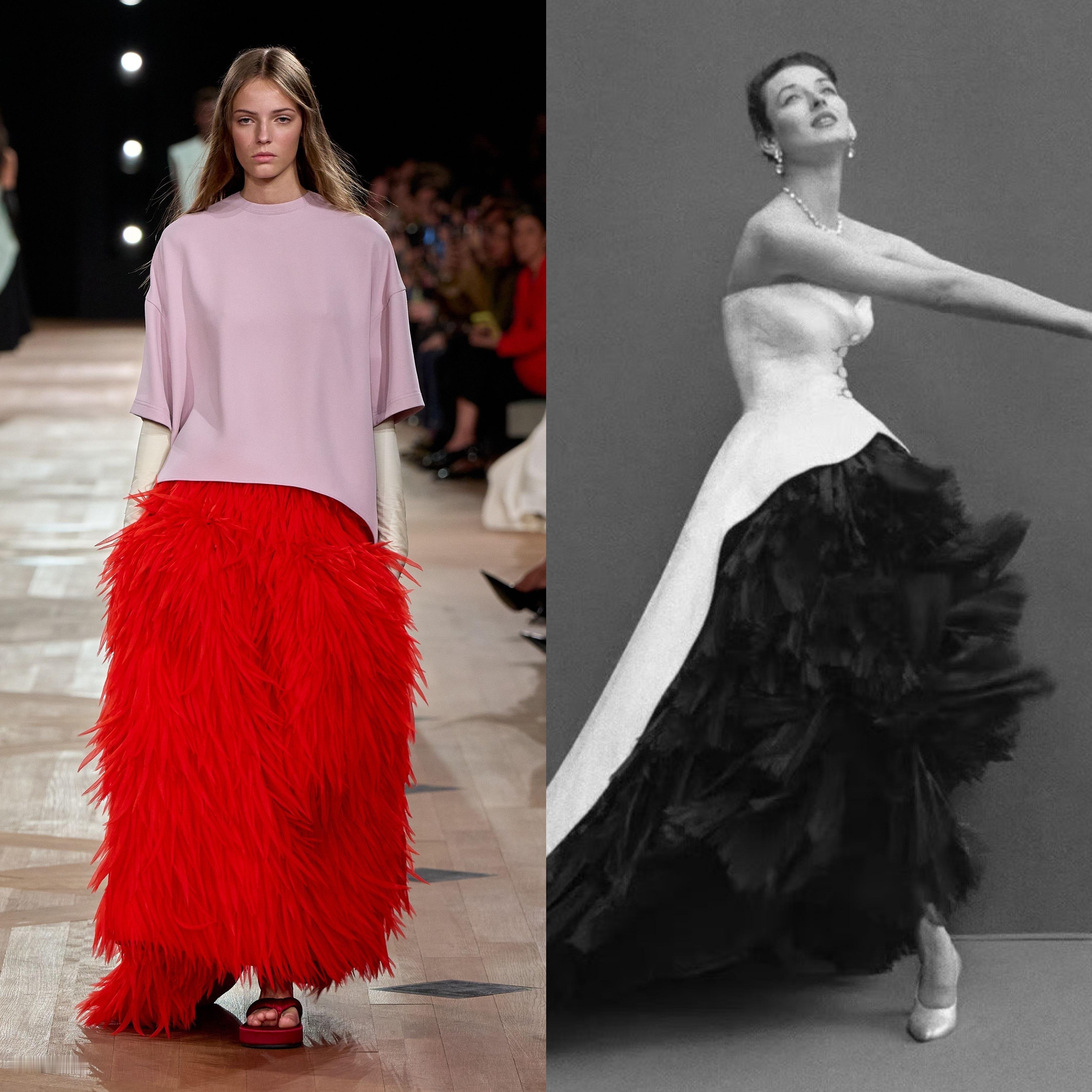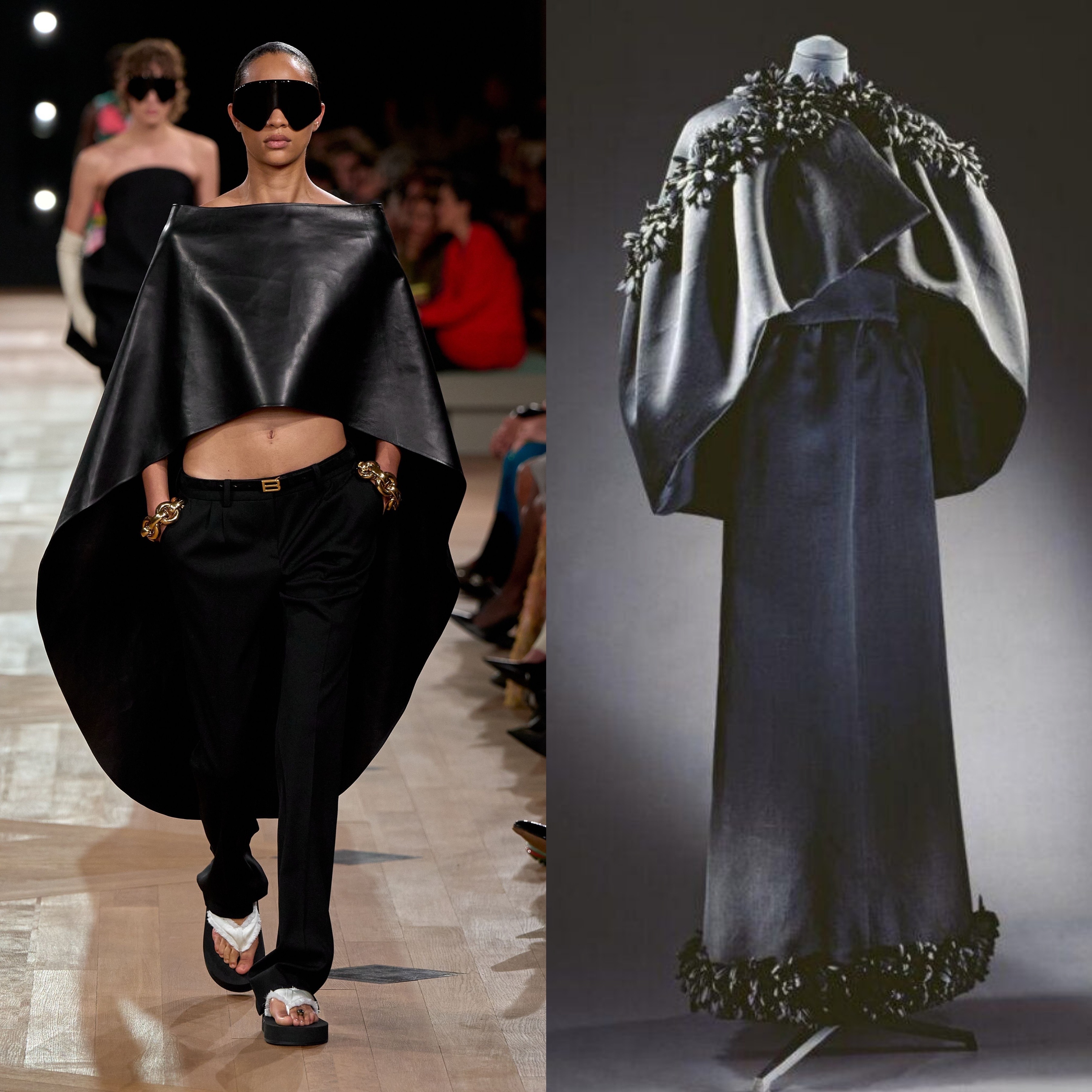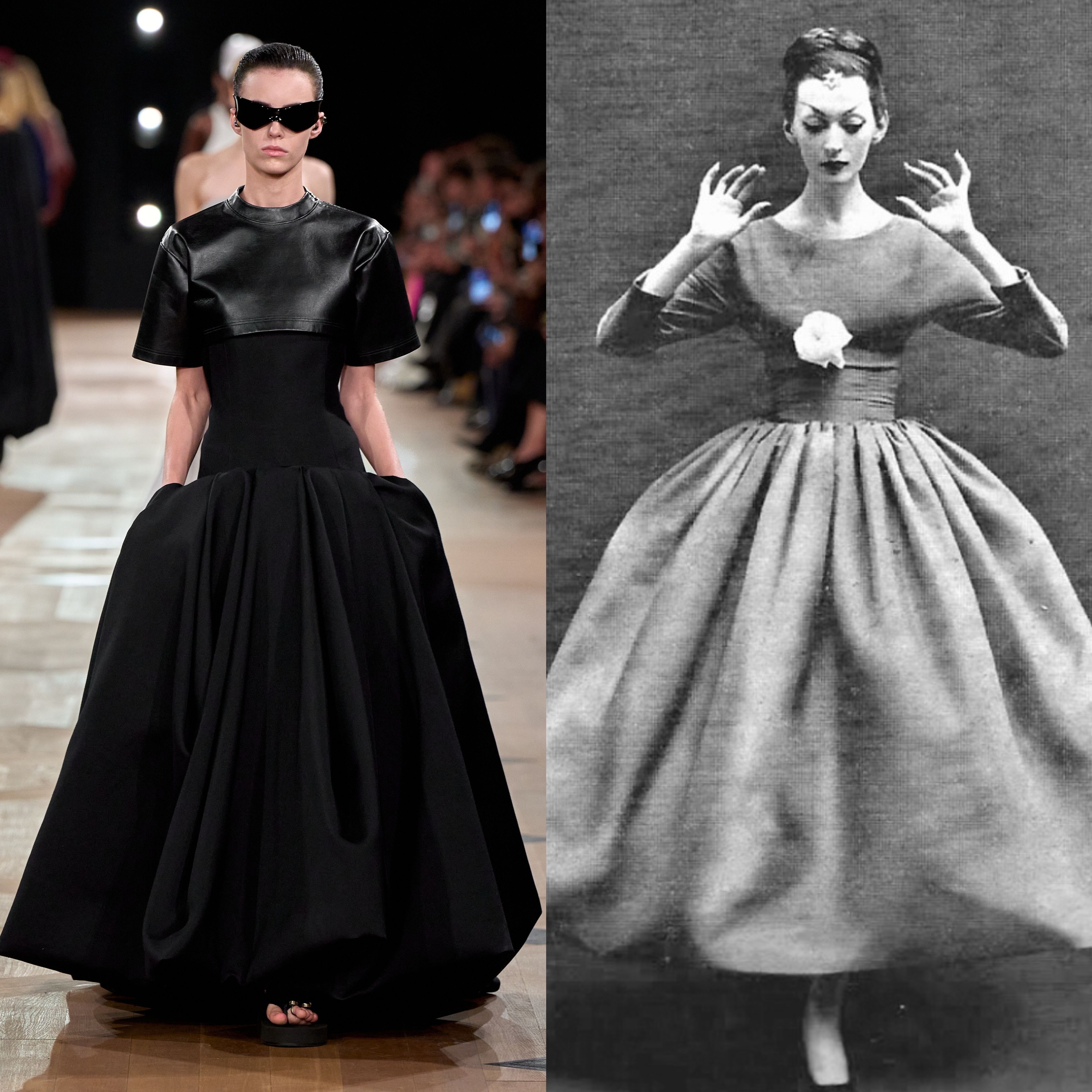 延续 Balenciaga 先生标志性的建筑感廓形与剪裁 ,在包括开场 、闭场在内多套 Look 都致敬了品牌 1958 年的Sack Dress ,以宽松而不失结构的现代裙装 ,重新诠释了对于服装空间感的独特理解 ;此外 ,1950 年代 Baby Doll 裙装 、1951 年的不对称层叠裙摆廓形 、1955 年的束腰设计 、1963年的立体花卉,这些出自创始人之手的经典设计元素在 Pierpaolo Piccioli 手下都被赋予了全新呈现 。值得关注的是 ,Nicolas Ghesquière 时期的标志性作品 ,如 2008 年春夏系列的花卉印花 ,以及 Demna 时期具有先锋怪诞基因的配饰 ,都被融入了本季设计语言 ,形成跨越品牌几代设计师的对话 。这种融合不仅体现在单品细节 ,更贯穿于整体系列的叙事逻辑 —— 从廓形到材质 ,每一件作品都在当代时装语境中延续着品牌的百年心跳 。