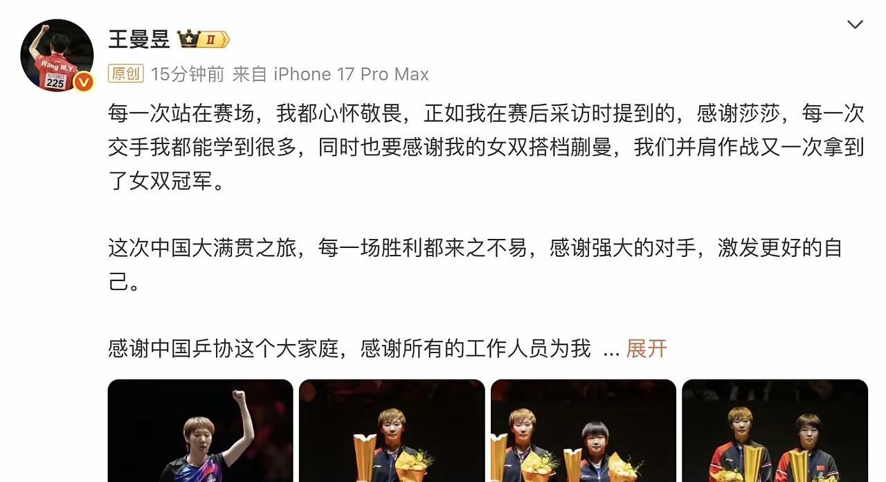 王曼昱拿了WTT中国大满贯冠军,晚上直接发了文,头一句就说要感谢莎莎和蒯曼——这