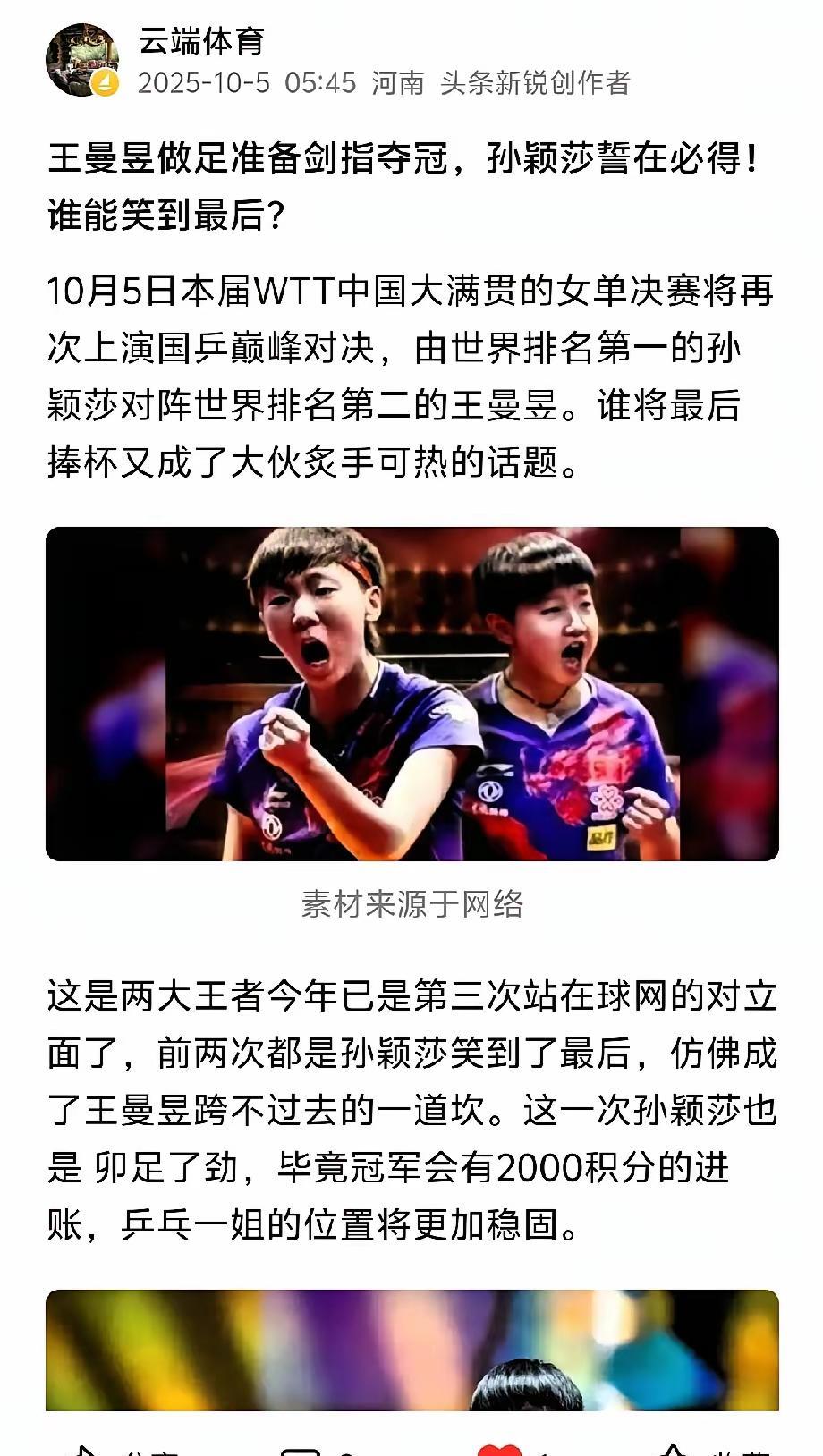 王曼昱那快6万粉丝到底跑哪儿去了?今早我刷到篇文,明明白白写着她指定能拿中国大满贯女单冠军,我在里头把话掰得透透的——曼昱为了这冠军,前期功课做得到位得很,训练上拼尽全力不说,战术上也抠得细,连对手可能的打法都摸得门儿清,怎么看都是冲冠的硬茬。 结果呢?文章发出去凉得离谱,没人点赞就算了,阅读量就1个,还是我自己点进去看的!难不成这么多人都不看好她?都不盼着她夺冠? 现在好了,王曼昱直接拿了女单冠军!我就说她争气!这冠军拿得太提气了,实打实靠自己拼出来的,好样的,必须给她狠狠鼓掌!