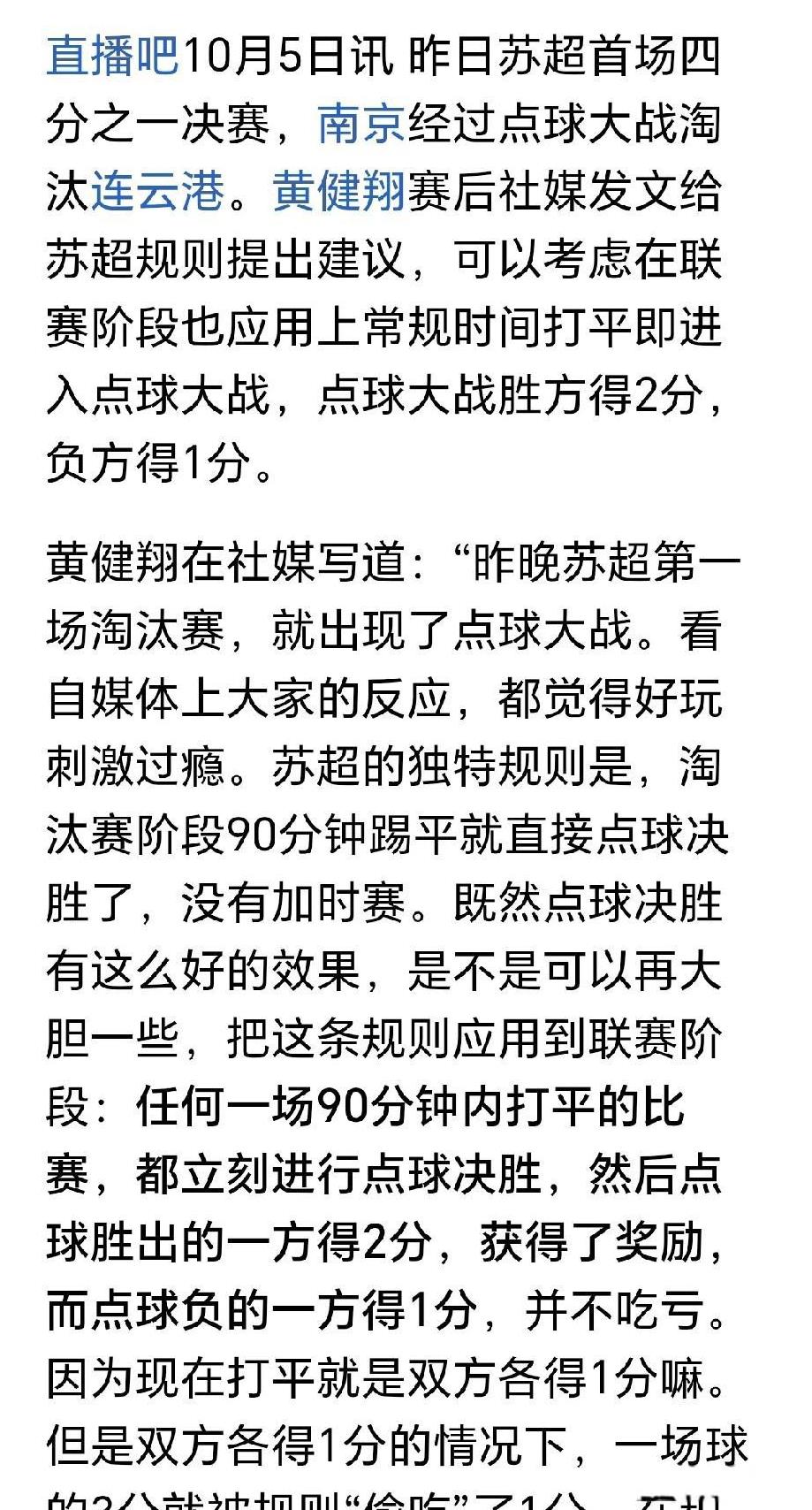 徐州队被淘汰确实可惜,但是半决赛总共就四支队伍,你不被淘汰,那就要淘汰泰州队了,点球能力强也是优点,所以徐州回家多练练点球技术吧! 当然,下面半年,苏超十三个队都要好好练练点球,因为黄健翔已经给我们苏超提了一个建议,那就是明年苏超打平就踢点球,踢赢的2分,踢输的1分,这样点球能力强的更占优势! 黄健翔作为江苏足球圈的大佬级人物,他的建议被采纳的可能性还是很大的。 打平踢点球会让比赛没有平局,让比赛更有戏剧性和刺激性,这个建议对苏超来说还真是不错的!