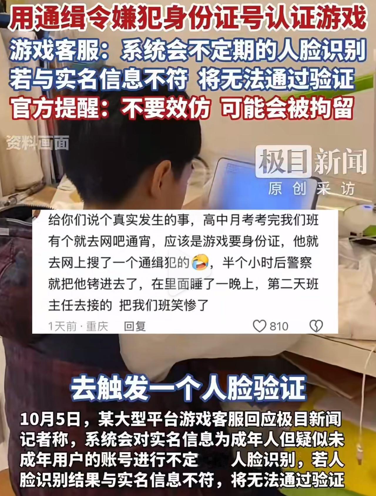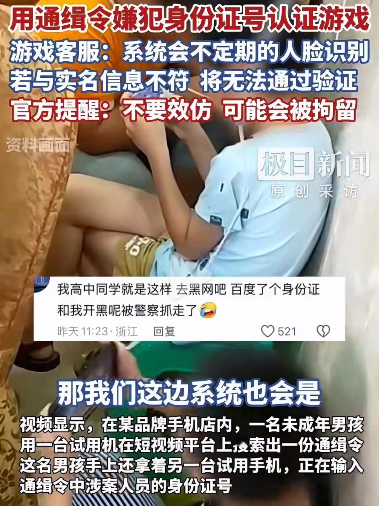 小孩哥拿通缉犯身份证号登游戏?这事儿谁能想到啊!通缉令上那诈骗犯的身份证号,居然被这孩子当成破解游戏实名的“小妙招”!山东那娃才十岁出头,凑在手机店摆弄试用机瞎折腾,居然是跟着短视频学的——你敢信?视频里直接挂着在逃人员的名字和身份证号,还特意标了“拿去给游戏实名用”,这不就是明着把歪路往孩子跟前递嘛! 游戏平台嘴上说后续会用人脸识别核查,可关键问题在这儿:凭个身份证号就能先过初始认证,这不明摆着给漏洞留了个大豁口!之前就有孩子因为盗用通缉犯信息,被警察找上门教育过。结果现在倒好,还有人把这种犯法的事儿,当成“游戏小攻略”到处瞎传! 这真不是孩子“不懂事”那么简单。有数据说就15%的孩子知道冒用身份证违法,学校每周那点网络安全课根本不够用;三成多家长连防沉迷到底是咋回事都摸不清,整天就盯着孩子玩游戏的时长,压根没跟娃念叨过“身份证号可不能瞎用,用错了要担责任”!短视频平台就不管管这些破玩意儿?游戏平台为了凑日活,故意把实名门槛放得低低的,还有人专靠租号买号赚黑心钱,这从头到尾,就没一个环节把着点关! 千万别觉得这是小事!用通缉犯信息实名,特容易触发公安系统预警,到时候娃说不定会被当成嫌疑人关联人员调查。身份证这玩意儿是咱的“数字身份牌”,可不是随便进游戏的门票!就为图一时省事耍点小聪明,搞不好就得留下一辈子的诚信污点,多不值当!要堵上这个坑,游戏平台打一开始就得强制用人脸识别,学校得正经教孩子护好自己的身份信息,家长更得跟娃把法律底线讲透——谁愿意看着孩子因为一时糊涂栽进去啊!游戏账号骗局 小孩哥游戏 网上通缉