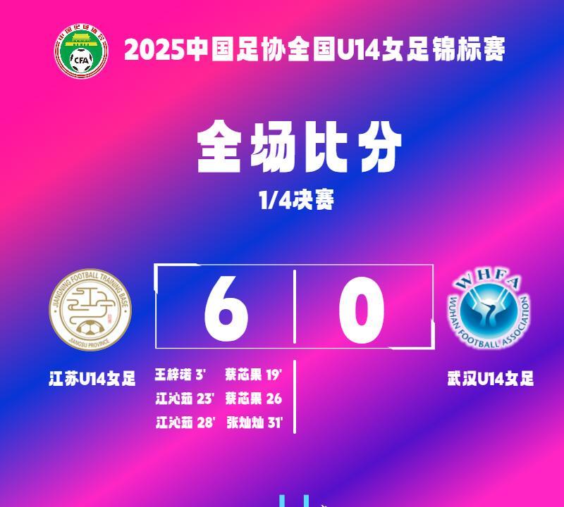 U14锦标赛|1/4决赛,蔡芯果、江沁茹梅开二度、王梓诺和张灿灿进球,江苏U14