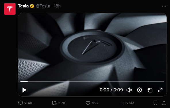 昨天,特斯拉海外官推连放两条预告:先是旋转T标轮毂盖视频露“10.7”日期,再释出穿透迷雾的前大灯画面,样式贴合新车型特征。