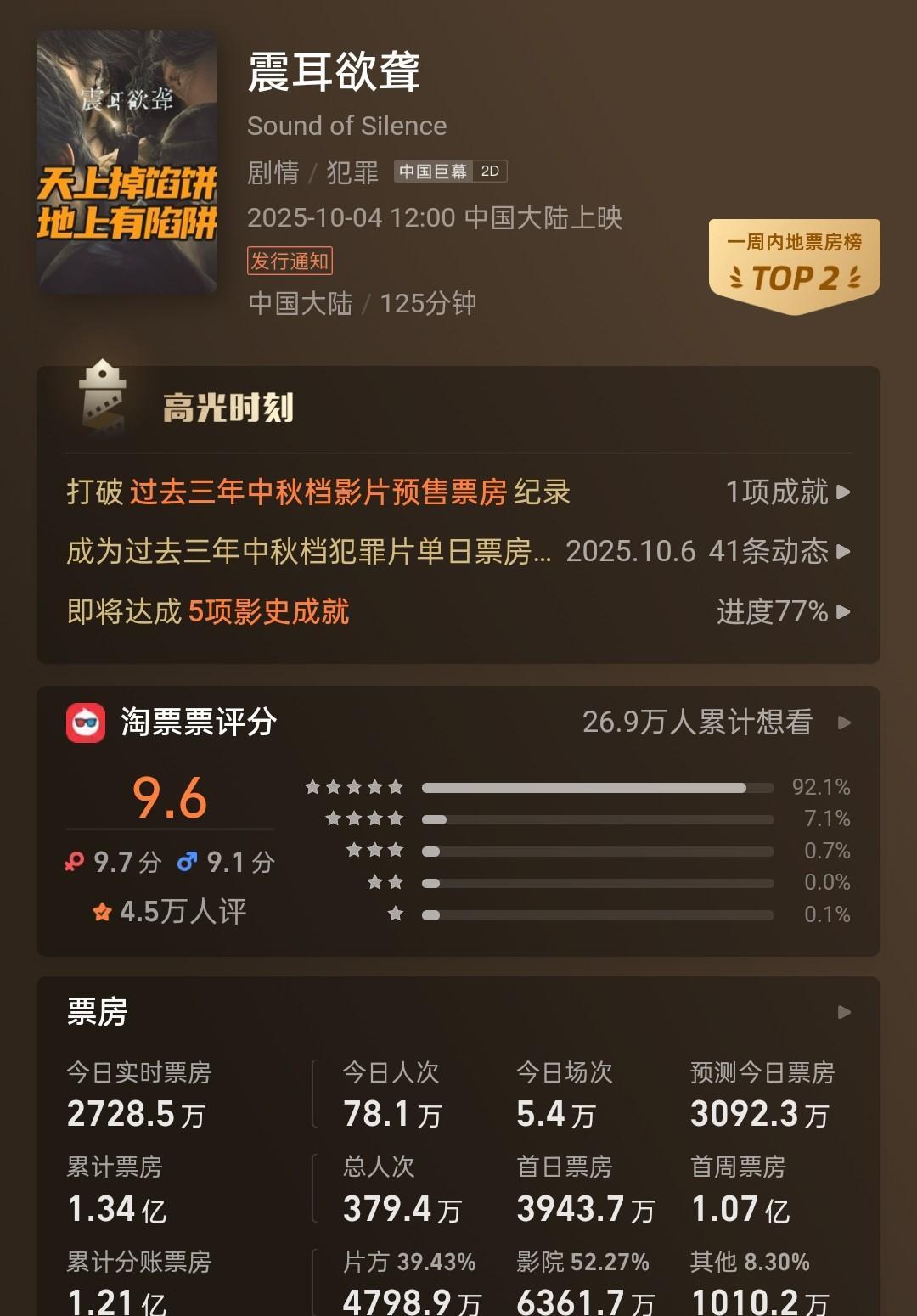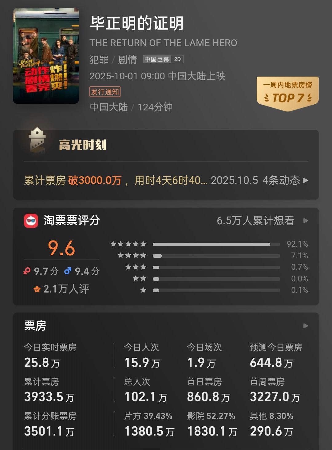 今年国庆档,有两部电影豆瓣刚开分是排在国庆档第一的,一部是檀健次的《震耳欲聋》,一部是王安宇的《毕正明的证明》,都有7.6分的口碑。 不过,两部片子的票房差距却很大,《震耳欲聋》上映3天票房1.34亿,《毕正明的证明》上映6天,票房却仅有3900多万。 这时候,有网友就提出这么一个观点,小成本的现实题材影片,如果想要好的票房,就必须找稍微有演技的流量明星。就比如《震耳欲聋》,选择了檀健次这个目前有流量的演员,而且,演技上也说的过去。 回头看看《毕正明的证明》,王安宇流量就没有檀健次高,并不是说他演技不行,而是观众在选择电影的时候,有一部分是冲着演员去的,如果演员知名度不高,吸引力是不够的。 这方面,程耳和毕赣就做的很好,《无名》选了王一博,《狂野时代》选了易烊千玺,电影关注度都特别高。#秋日生活打卡季#