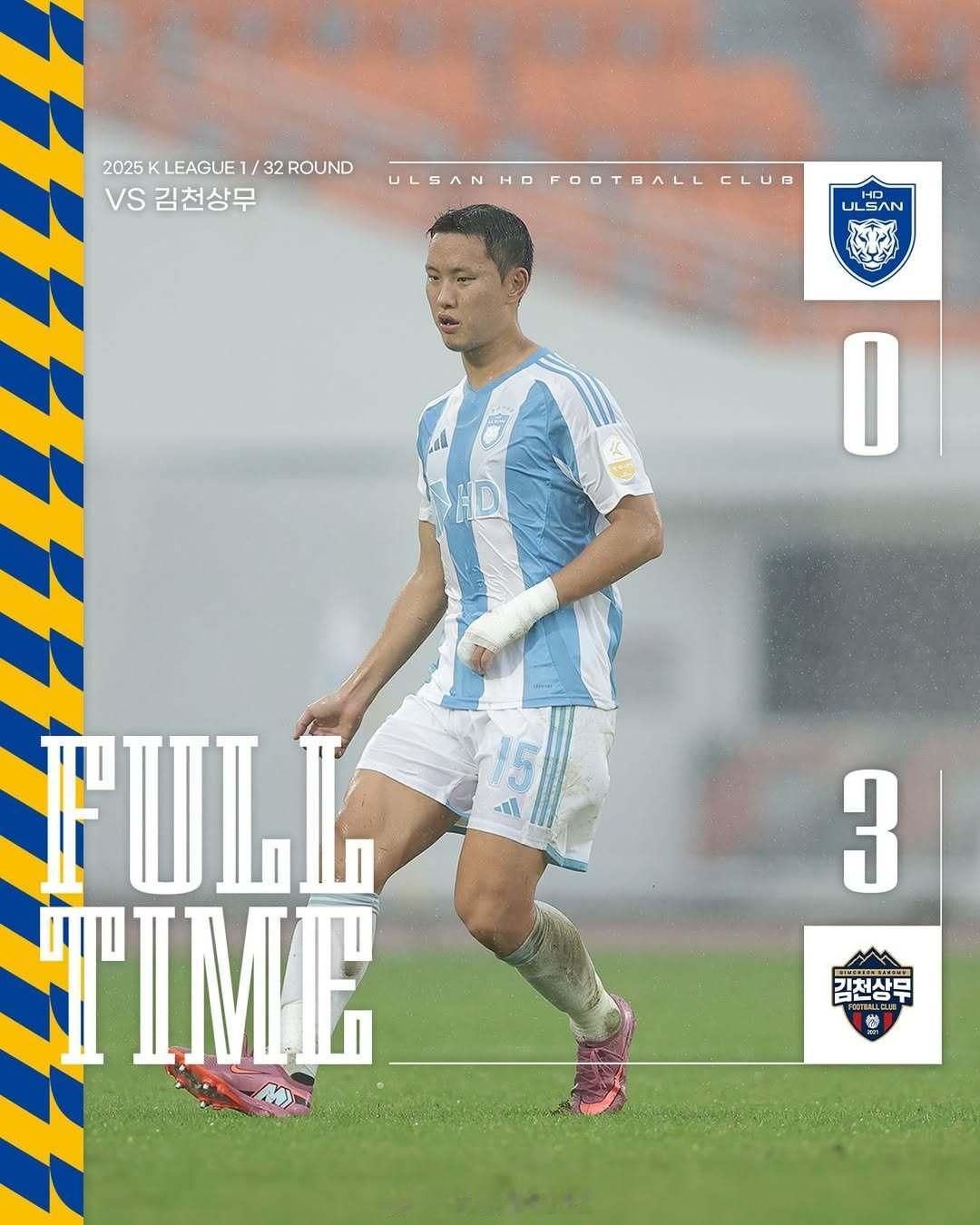 1-1战平上海申花的蔚山HD,转过头来在联赛面对军旅球队金泉尚武输了个0-3。蔚山已经确定落入保级组,继续徘徊在降级区。