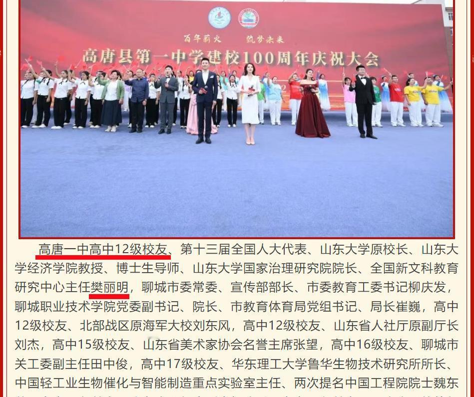 山东大学的前校长樊丽明,原来是山东聊城市高唐县第一中学的校友。前几天参加高唐