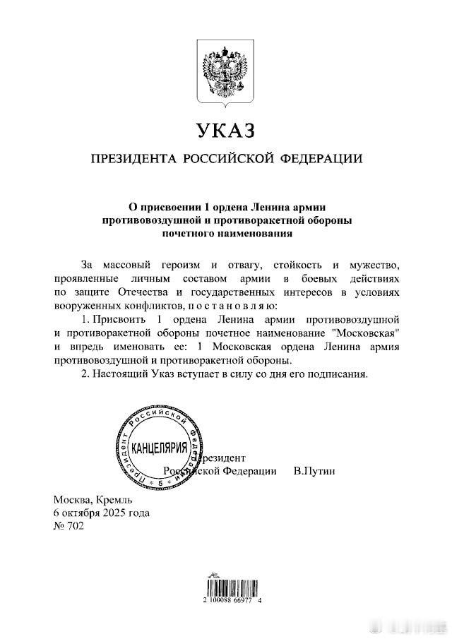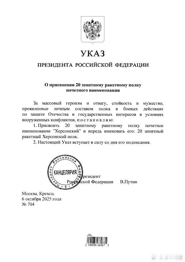 普京签署法令,授予第1反导防空集团军荣誉称号“莫斯科”,授予第6合成集团军近卫称号,授予第20防空导弹团荣誉称号“赫尔松”。