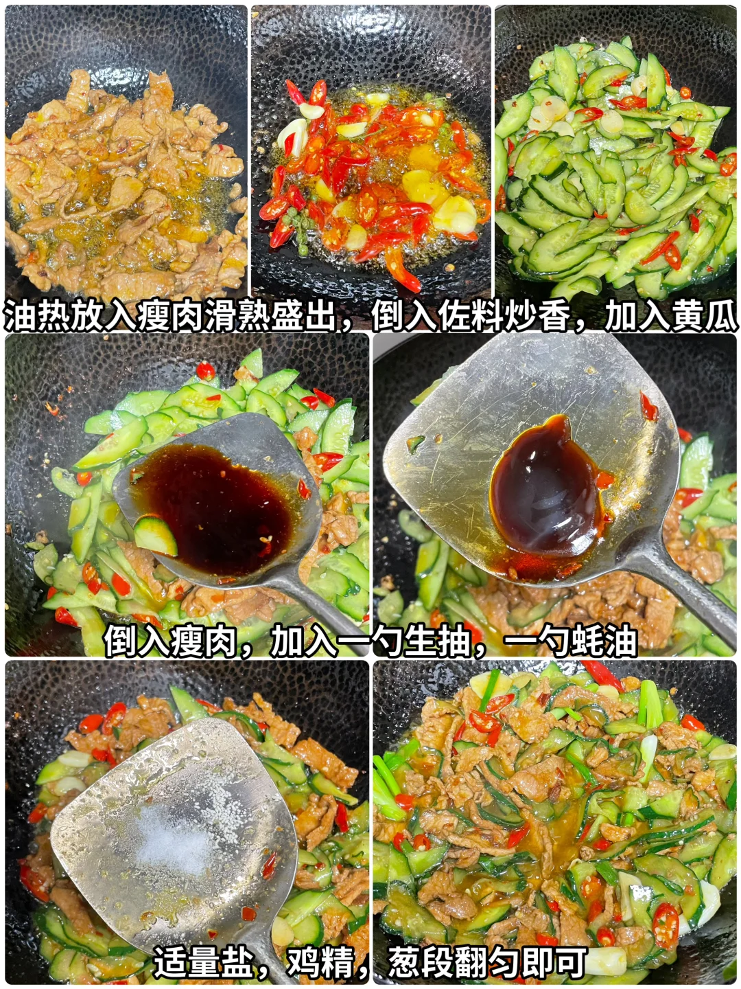 3⃣️起锅烧油,油热将瘦肉滑熟盛出备用,锅里放底油炒香蒜,小米辣,花椒。然后放入黄瓜片翻匀,倒入瘦肉,调味来一勺生抽,一勺蚝油,适量的盐鸡精翻匀,再加入葱段翻匀即可出锅,这样做成黄瓜肉片真的巨下饭。