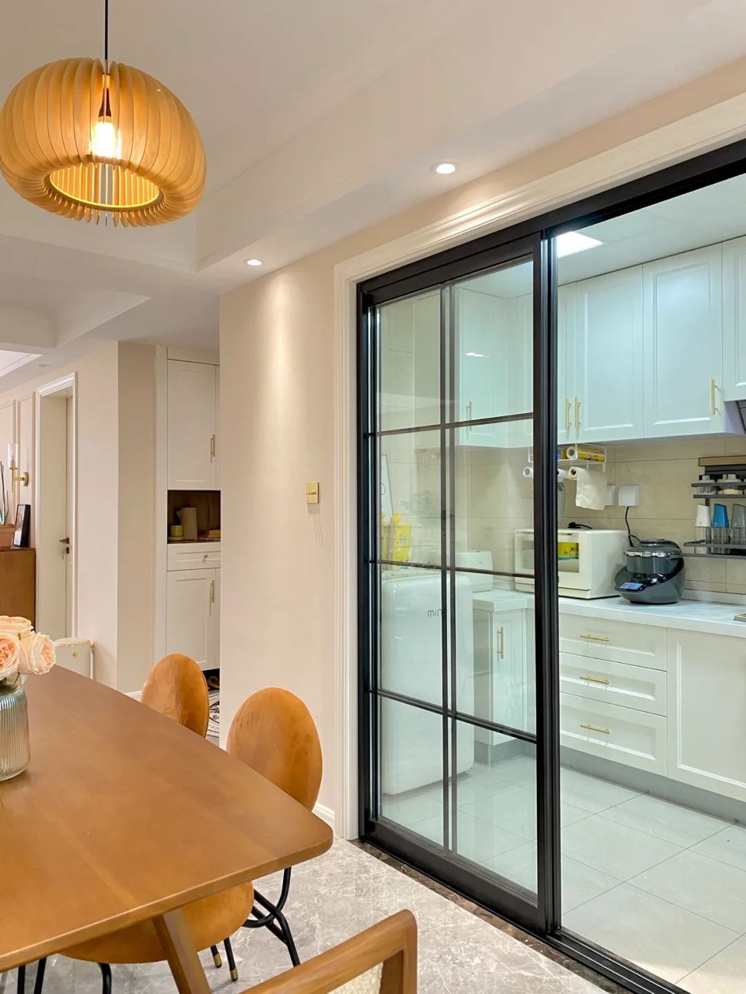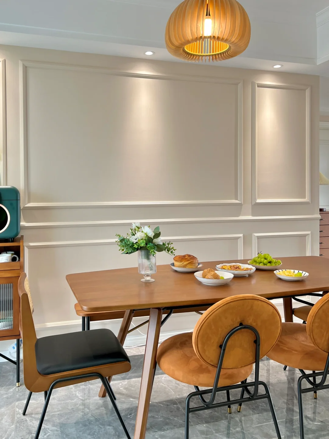 背景墙是用4.5cm的石膏线做了简单的框架结构,然后再统一刷了奶咖色的乳胶漆。腰线的高度离地是90cm。