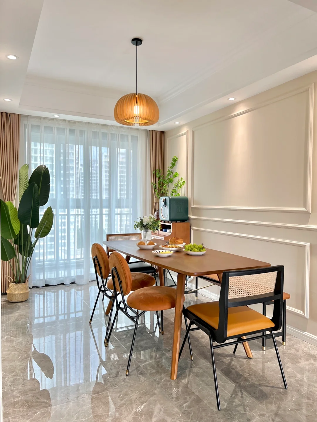 材质都是黄杨木的,餐桌尺寸是:长180cm,宽80cm放在我家客厅刚刚好。餐椅我进行了混搭,这样会更特别一点。